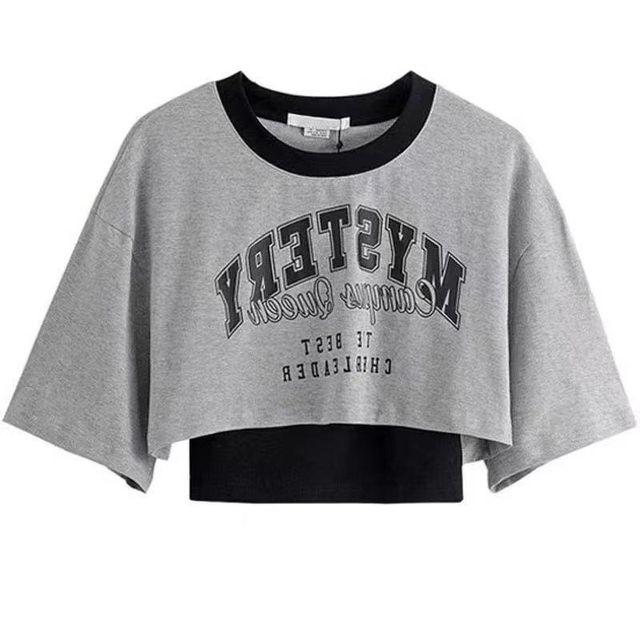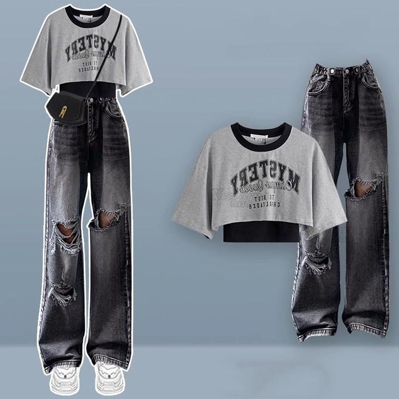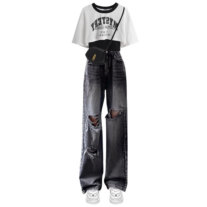 Весенне-летний милый крутой комплект для студенток, модная корейская футболка + персонализированные рваные джинсы, комплект из двух предметов