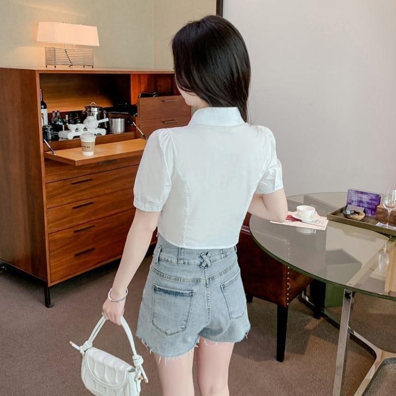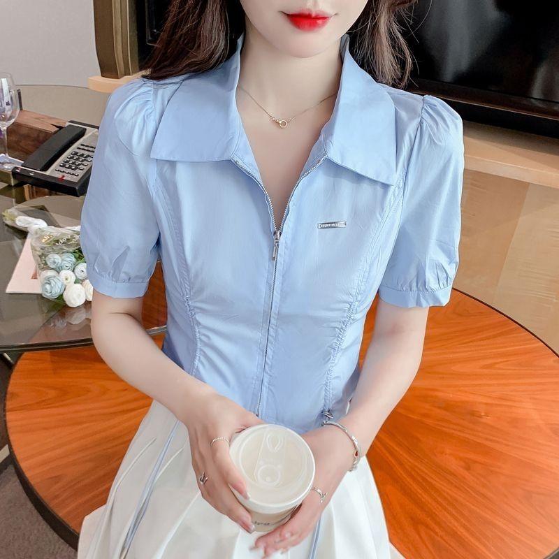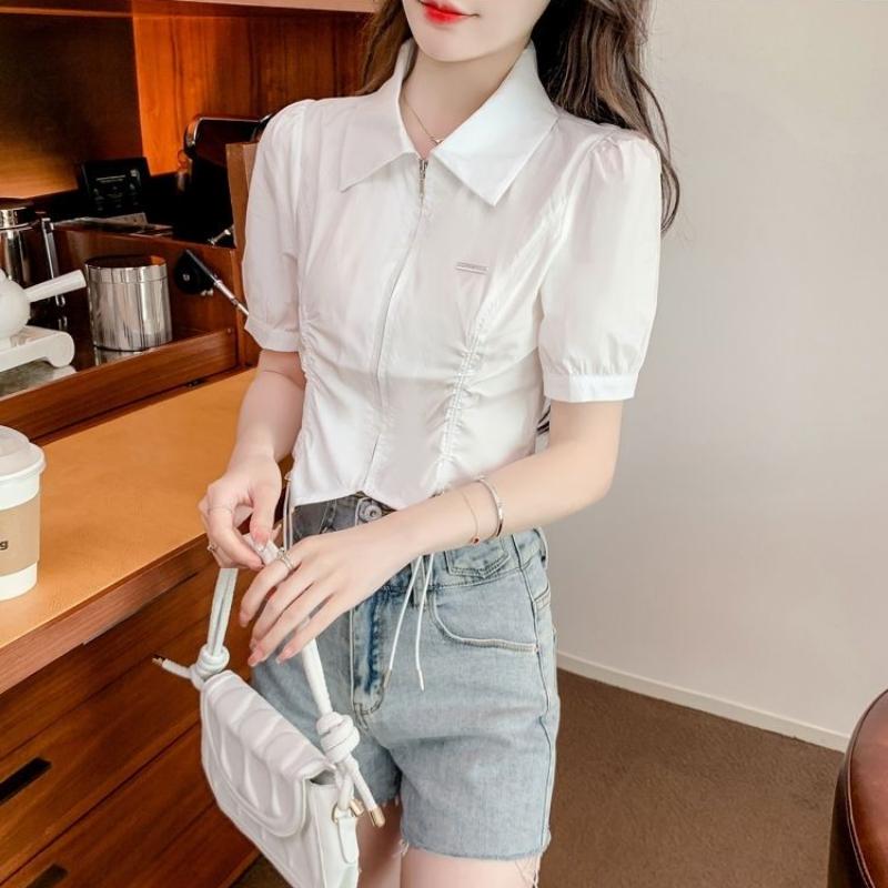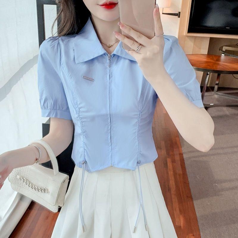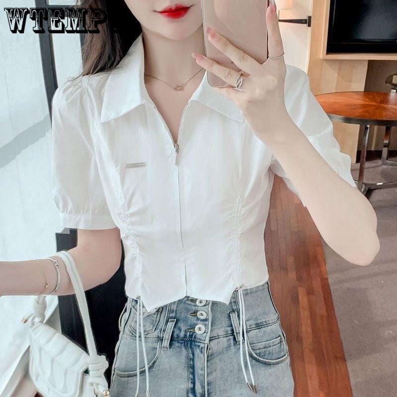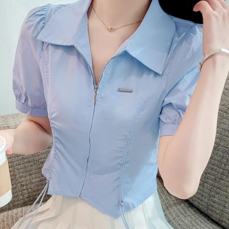 Летняя женская рубашка-кардиган на молнии с объемными рукавами, короткие модные шикарные нишевые топы с завязками на талии и дизайном