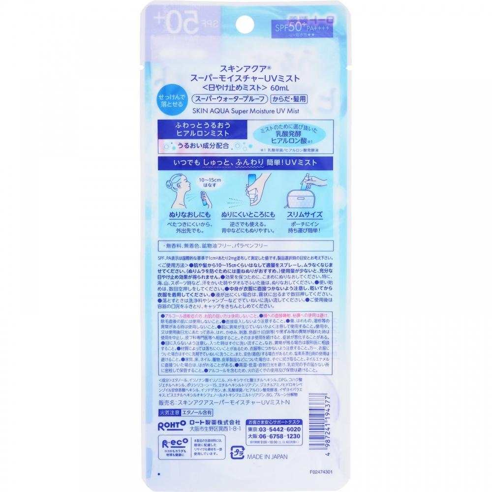Skin Aqua Rohto Pharmaceutical Skin Aqua Super Moisture UV Mist 60 мл обладает превосходной УФ-защитой и исключительной простотой использования для ежедневной защиты от солнца.. Содержит специально отобранную ферментированную гиалуроновую кислоту, которая обеспечивает увлажнение при использовании в качестве миста. Этот продукт не содержит отдушек, красителей, минеральных масел и парабенов, что делает его безопасным для чувствительной кожи.. Кроме того, это суперводостойкий продукт с высокой способностью удерживать влагу, подходящий как для тела, так и для волос, и обеспечивает SPF50+/PA++++ для мощной защиты от солнца.