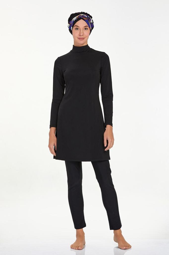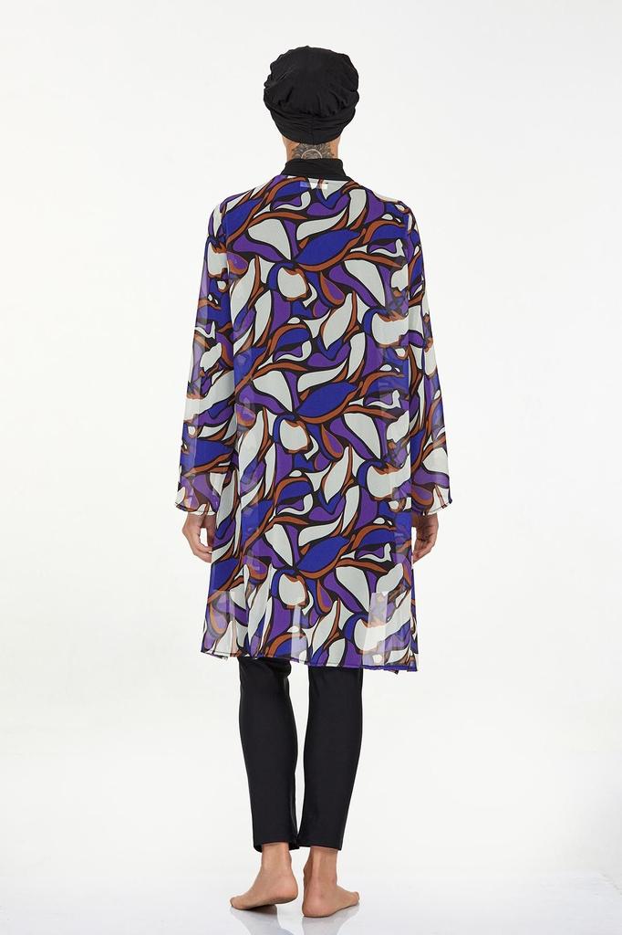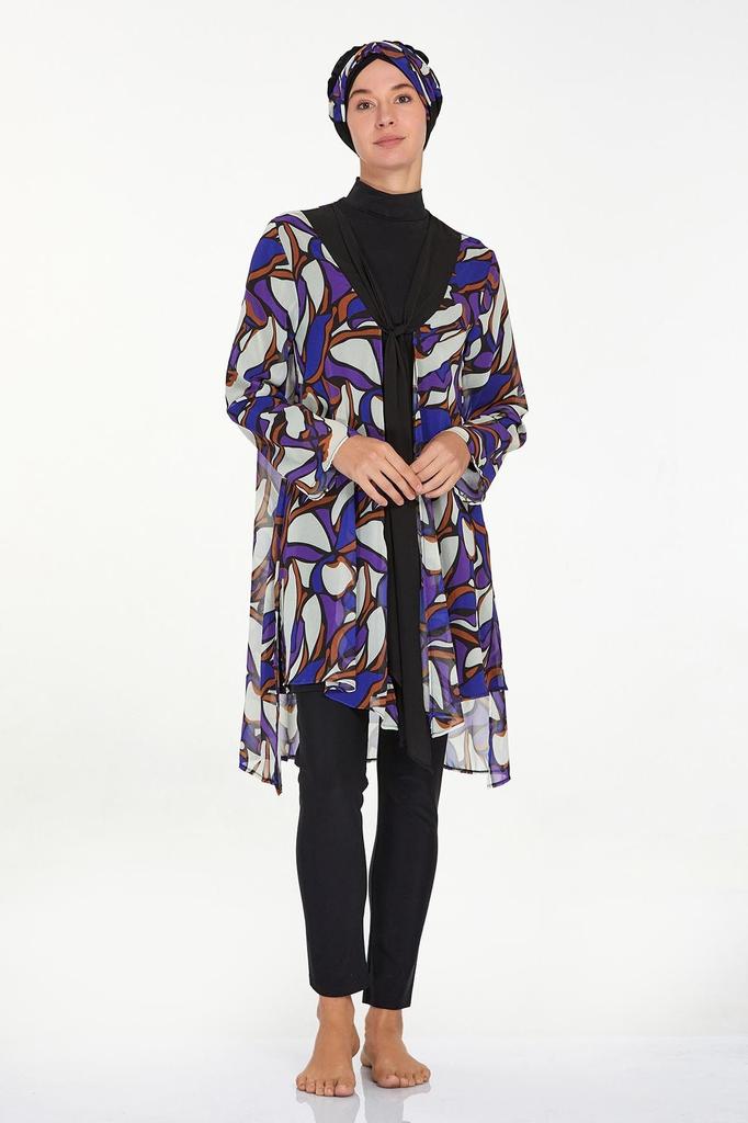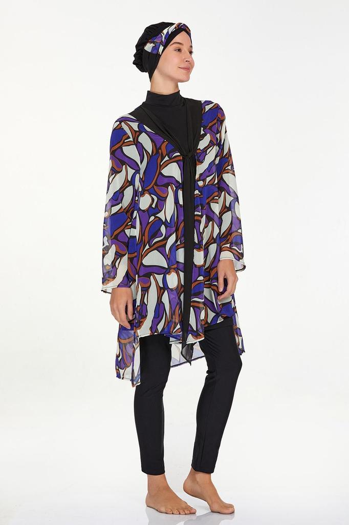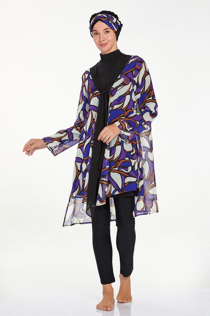 Наш тройной комплект из водоотталкивающей ткани для купальника парео, женский купальник в хиджабе состоит из 5 предметов.: Парео, верхняя туника, нижние брюки, нижнее белье и чепчик.