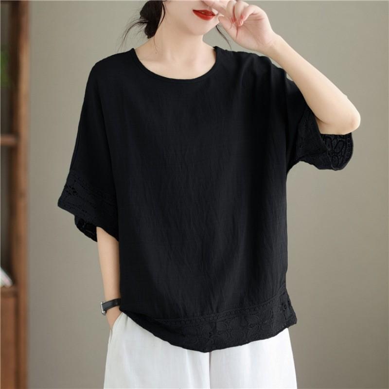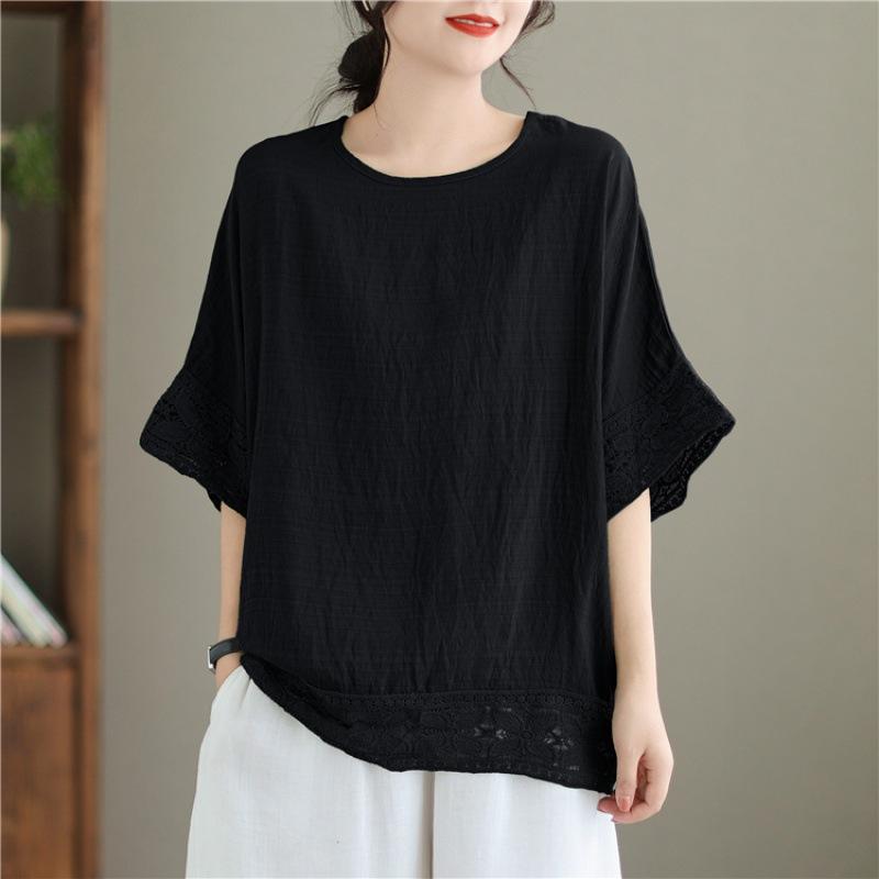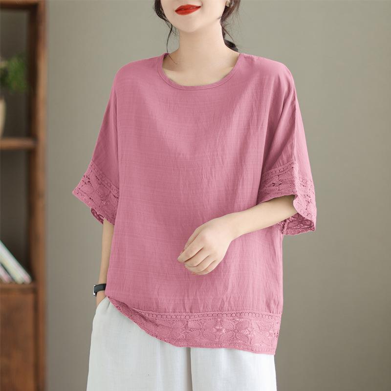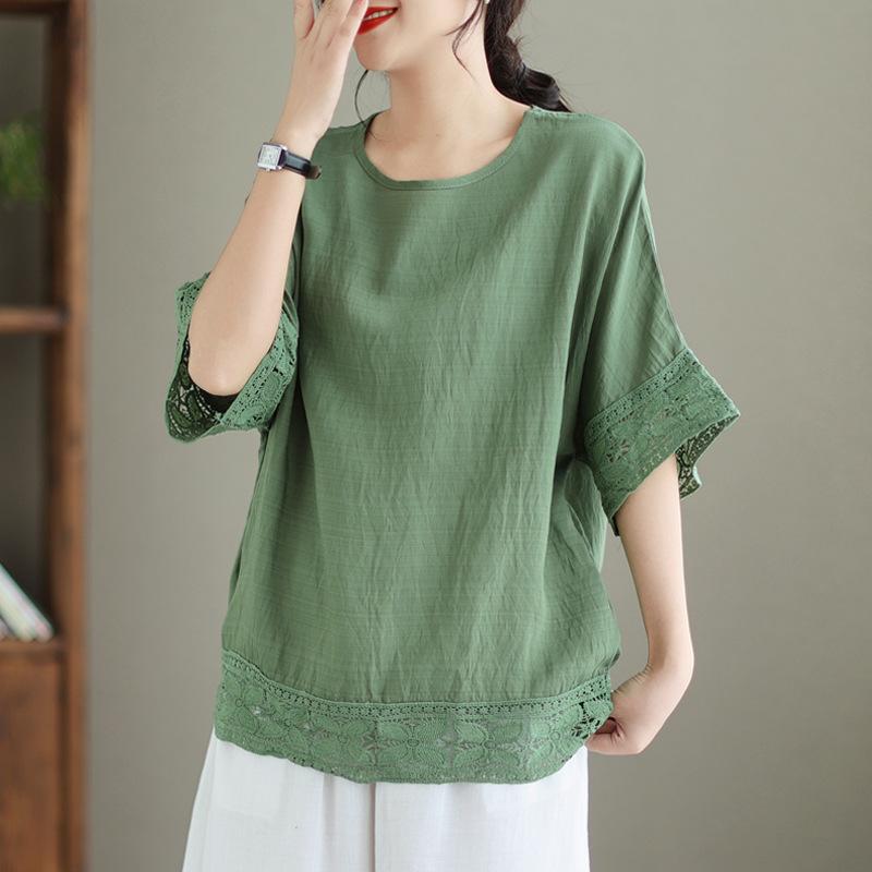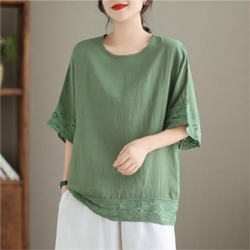 Johnature Повседневные женские топы с круглым вырезом и короткими рукавами, летние повседневные простые однотонные лоскутные кружевные свободные блузки