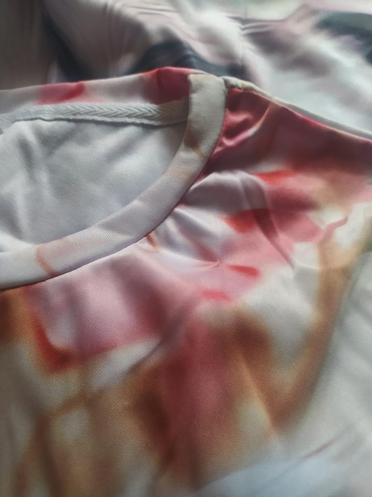 Футболка сшита неаккуратно - горловина футболки Спереди "морщит". Состав ткани - скорее всего полиэстер. Нигде не нашла ярлыка с составом ткани изделия. В общем какой-то "самопал". Не рекомендую покупать. Спасибо Joom