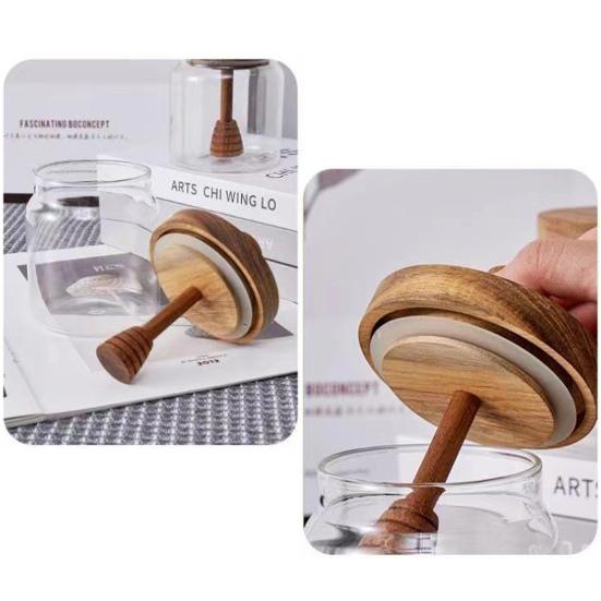 Инновационный дизайн «два в одном»: Встроенная деревянная крышка служит двойной цели, действуя как подставка для соуса и крышка.. Спиральная конструкция ковша для горшка для меда повышает чистоту и контролирует капание, обеспечивая беспрепятственное наслаждение медом.