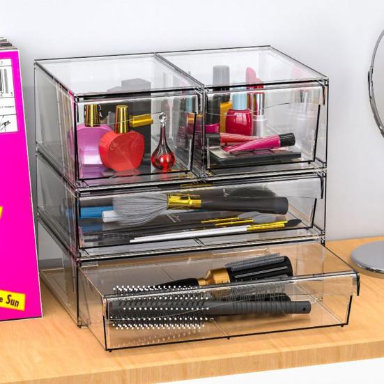 Организуйте свое пространство эффективно с помощью нашего ящика для хранения косметики.. Штабелируемая конструкция позволяет использовать ящики для хранения вертикально или рядом, максимально повышая эффективность хранения и экономя ценное пространство.. Настройте расположение в соответствии с вашими потребностями и используйте выдвижную ручку для легкого доступа, сохраняя при этом порядок вещей и защиту от пыли.. Каждый ящик оснащен силиконовой противоскользящей накладкой, обеспечивающей устойчивость на любой поверхности.