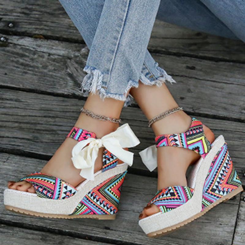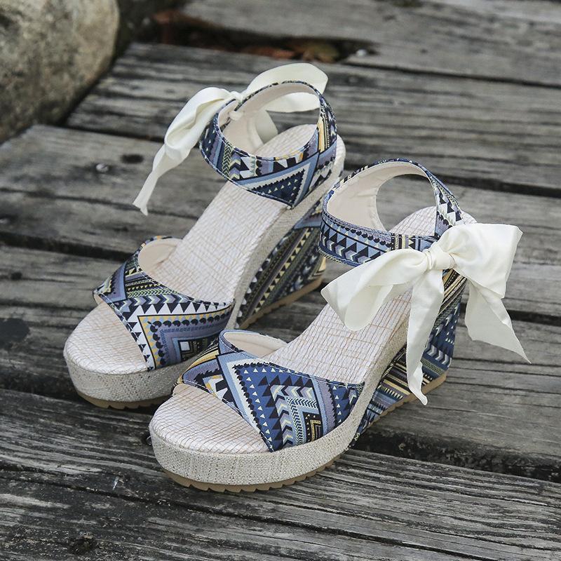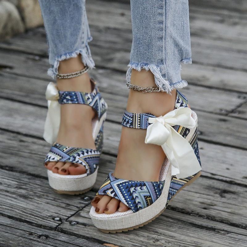 Женские летние пляжные сандалии на танкетке с цветочным принтом в стиле бохо, женские гладиаторы на платформе с ремешком на щиколотке, модные сандалии на высоком каблуке Sandalias Mujer