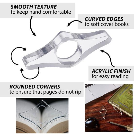 Держатель страниц книги изготовлен из прочного акрила и плотно прилегает к большому пальцу, уменьшая нагрузку на мизинец во время длительного чтения.