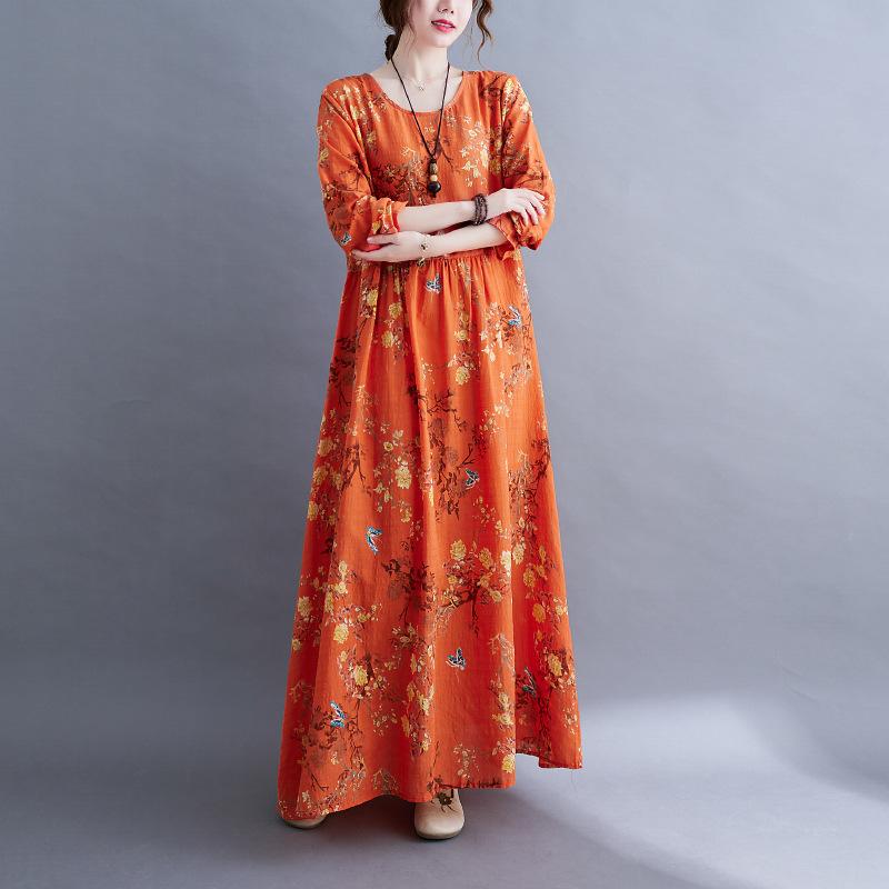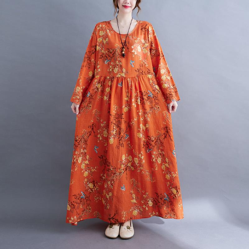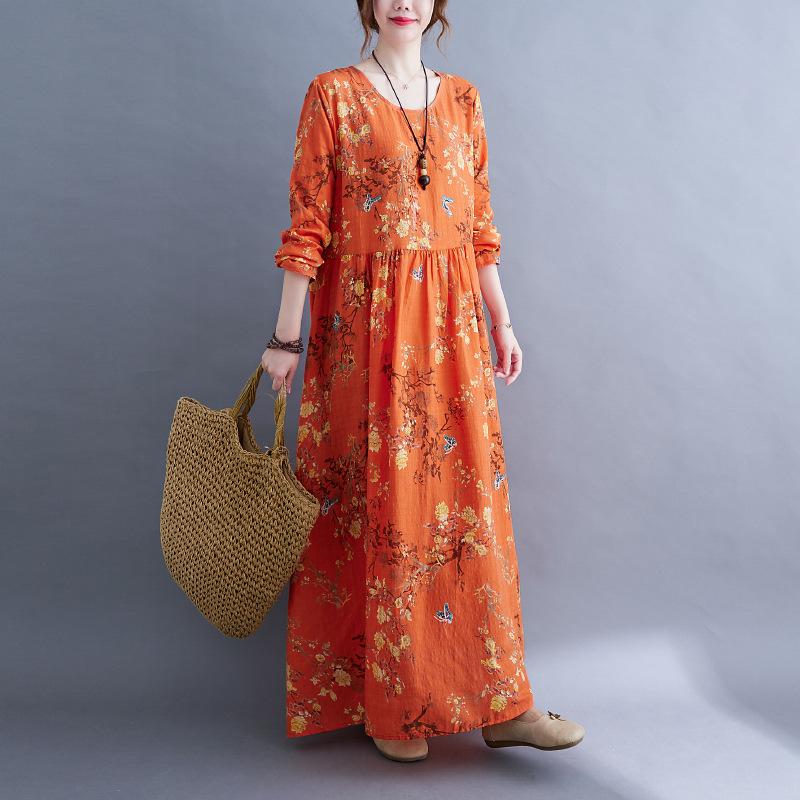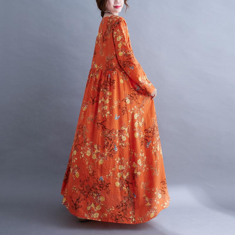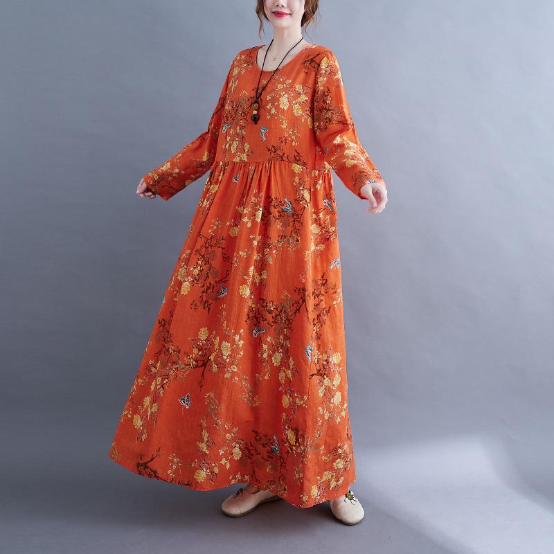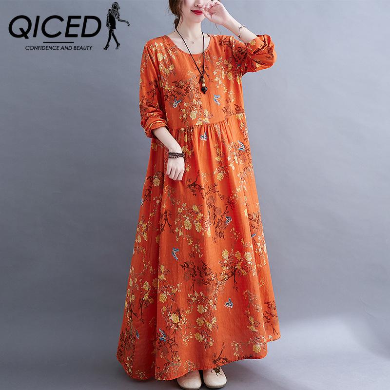 QICED Платье в национальном стиле с длинным рукавом, осеннее винтажное художественное платье с длинным рукавом и принтом, свободная большая юбка для женщин