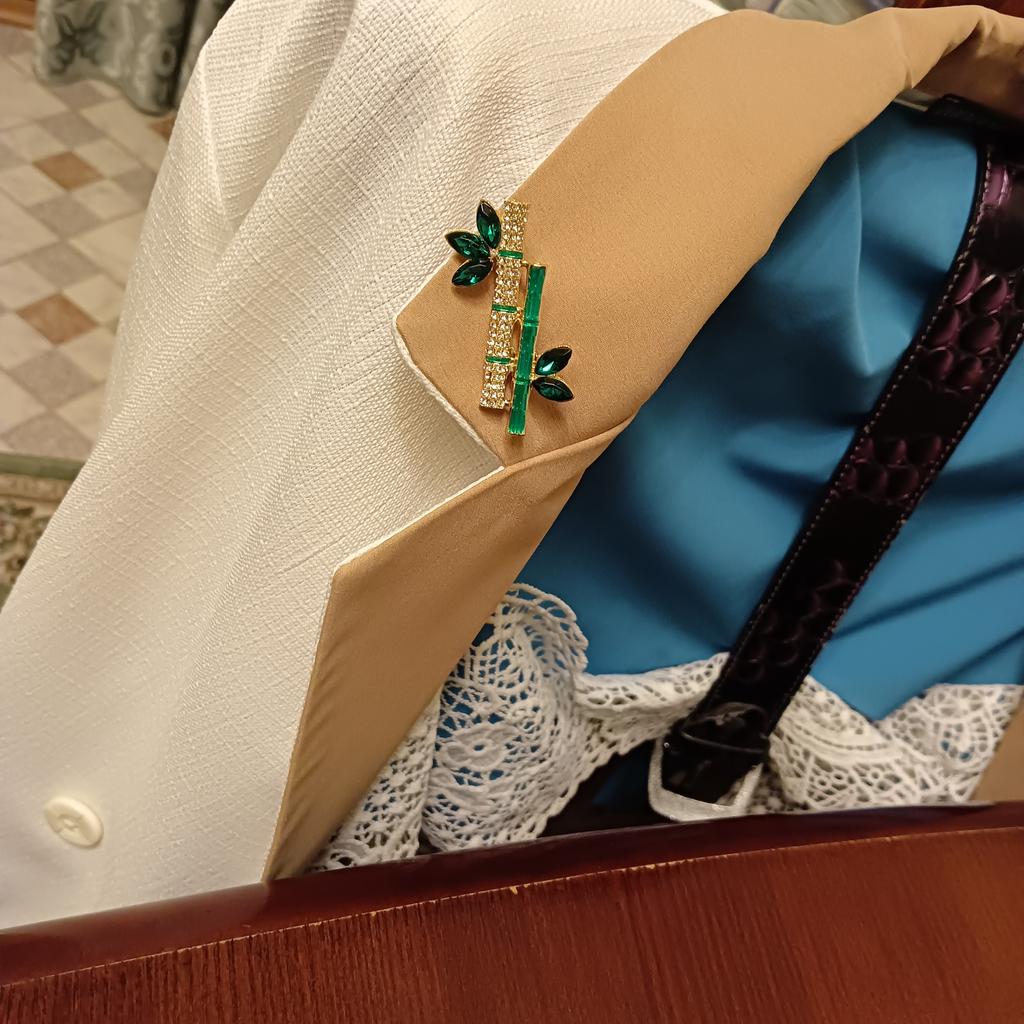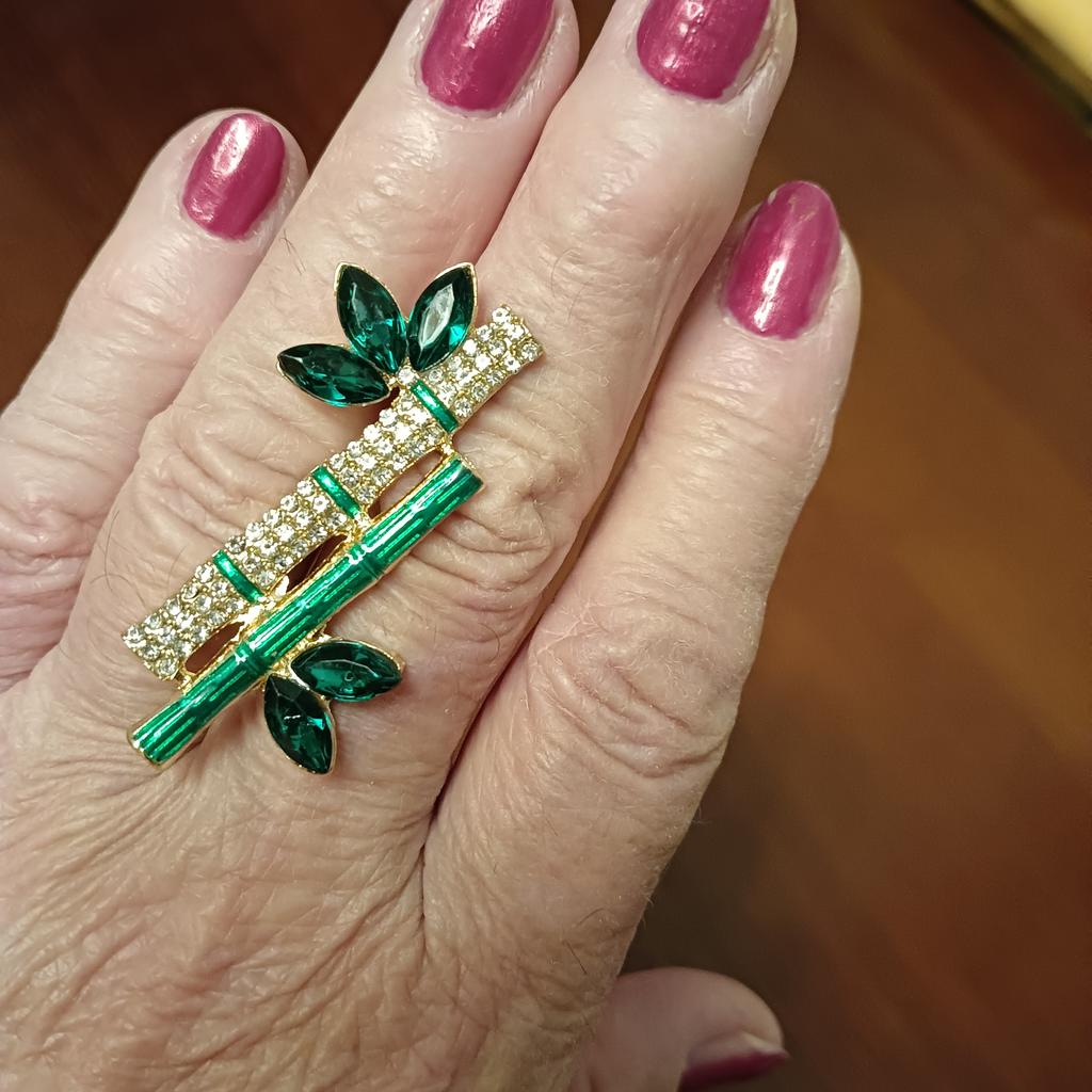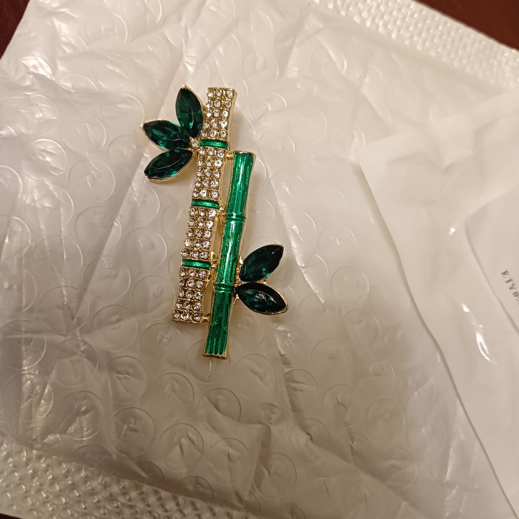Симпатичная брошка. Покупала за 99. Камушки все на месте. Зелёная часть бамбука - краска. Листики - приклеенные камушки. Надеюсь не выпадут. По белой бамбучине - россыпь маленьких "бриллиантиков". К сожалению видео не передало красоту блеска. Застёжка выглядит надёжно. Без замочка, но игла поджата так хорошо, что с упором входит в петлю и не вихляется. Заказом довольна, рекомендую, всем удачных покупок.