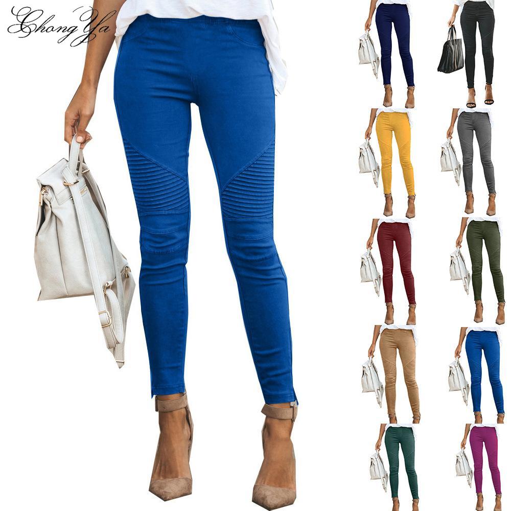 Женские джинсы, модные эластичные однотонные эластичные узкие брюки с рюшами, повседневные брюки