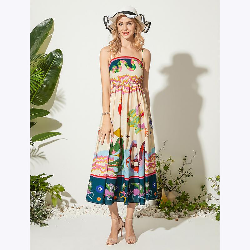 Летние женские винтажные сарафаны на подиуме с принтом на бретельках длинное макси праздничное пляжное платье