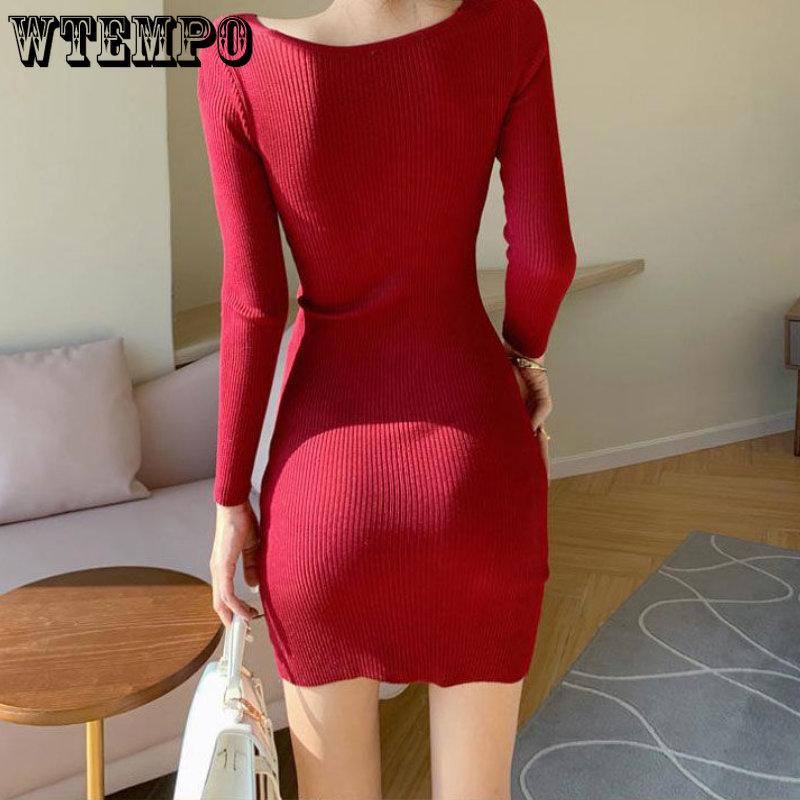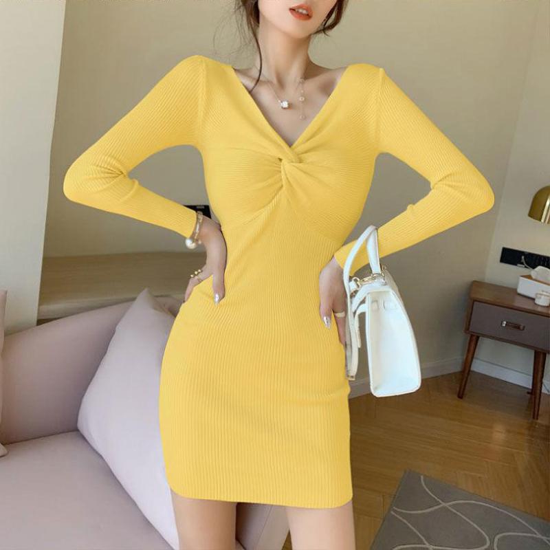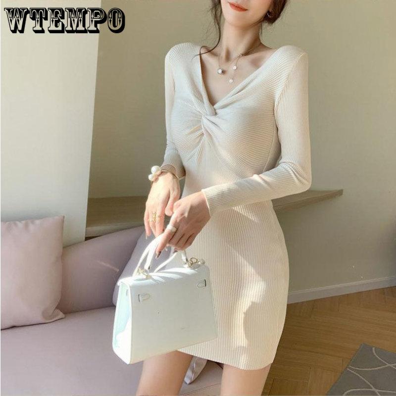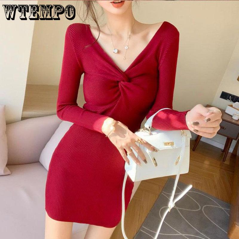 Весенне-осеннее женское платье с трикотажным низом, женское сексуальное трикотажное платье с v-образным вырезом, облегающее шерстяное платье с запахом на бедрах