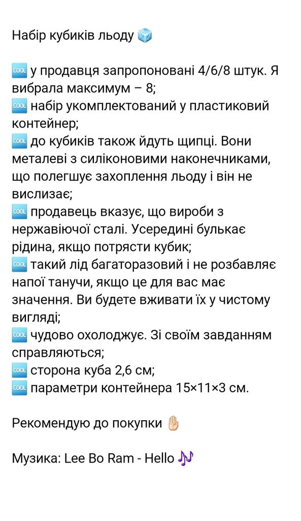 Набор кубиков льда 🧊 🆒️ у продавца предложены 4/6/8 штук. Я выбрала максимум - 8; 🆒️ набор укомплектован в пластиковый контейнер; 🆒️ к кубикам также идут щипцы. Они металлические с силиконовыми наконечниками, что упрощает захват льда и он не выскальзывает; 🆒️ продавец указывает, что изделия из нержавеющей стали. Внутри булькает жидкость, если потрясти кубик; 🆒️ такой лёд многоразовый и не разбавляет напитки тая, если это для вас имеет значение. Вы будете употреблять их в чистом виде; 🆒️ прекрасно охлаждает. Со своей задачей справляются; 🆒️ сторона куба 2,6 см; 🆒️ параметры контейнера 15×11×3 см. Рекомендую к покупке 🤚🏻 Музыка: Lee Bo Ram - Hello 🎶