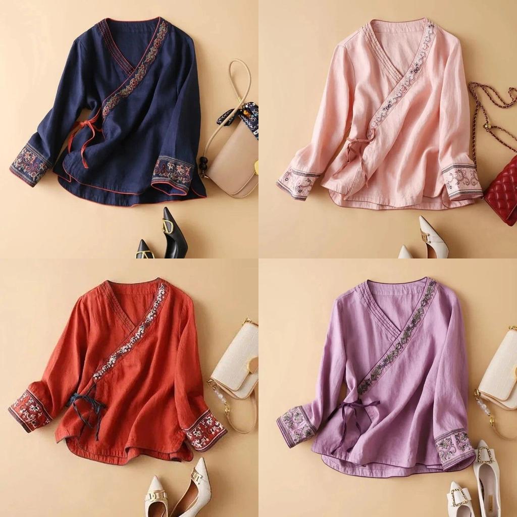 Летняя женская блузка из хлопка и льна в этническом стиле с косыми лацканами и вышивкой в литературном стиле, свободная одежда в стиле ретро, улучшенная одежда ханьфу в древнем стиле, чайная одежда дзен