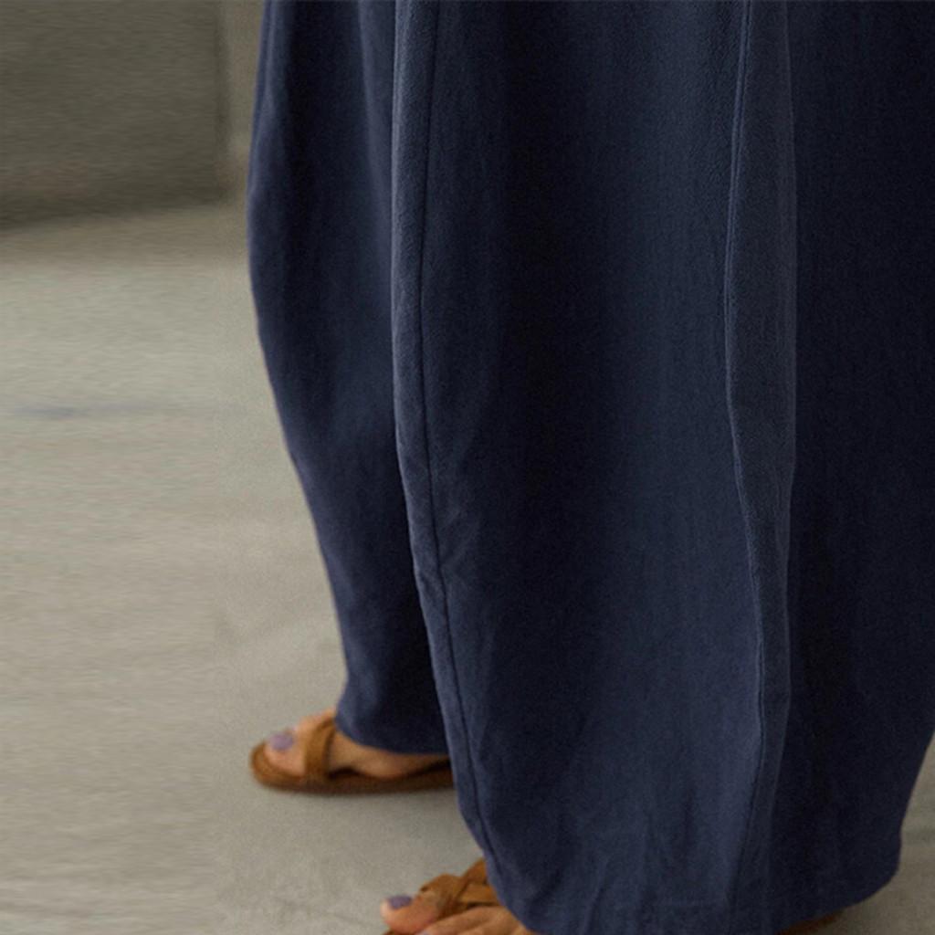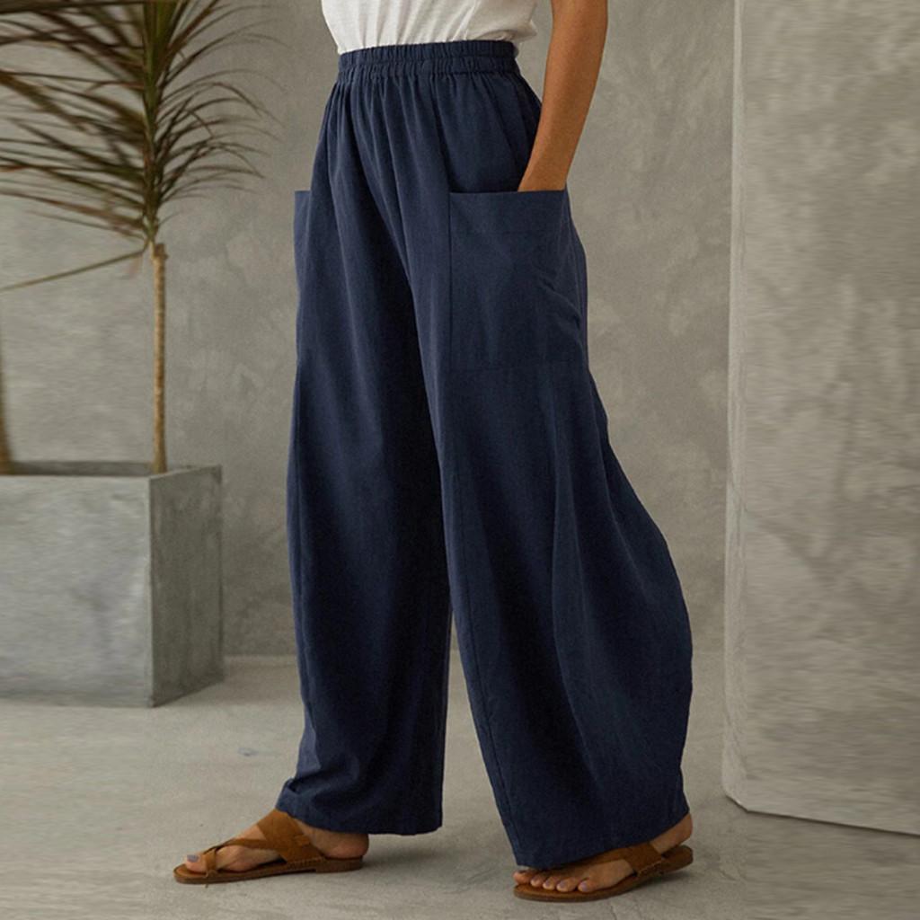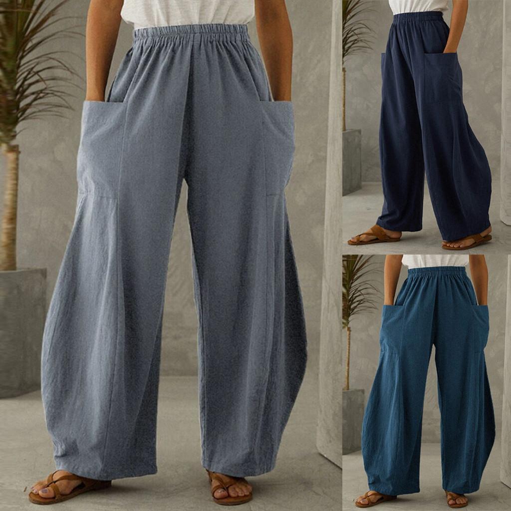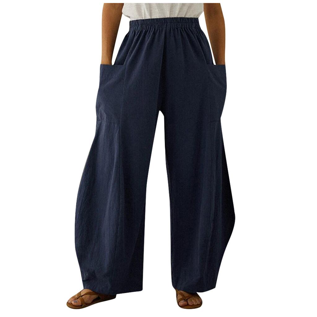 Модные женские свободные однотонные хлопковые льняные повседневные широкие брюки с большими карманами