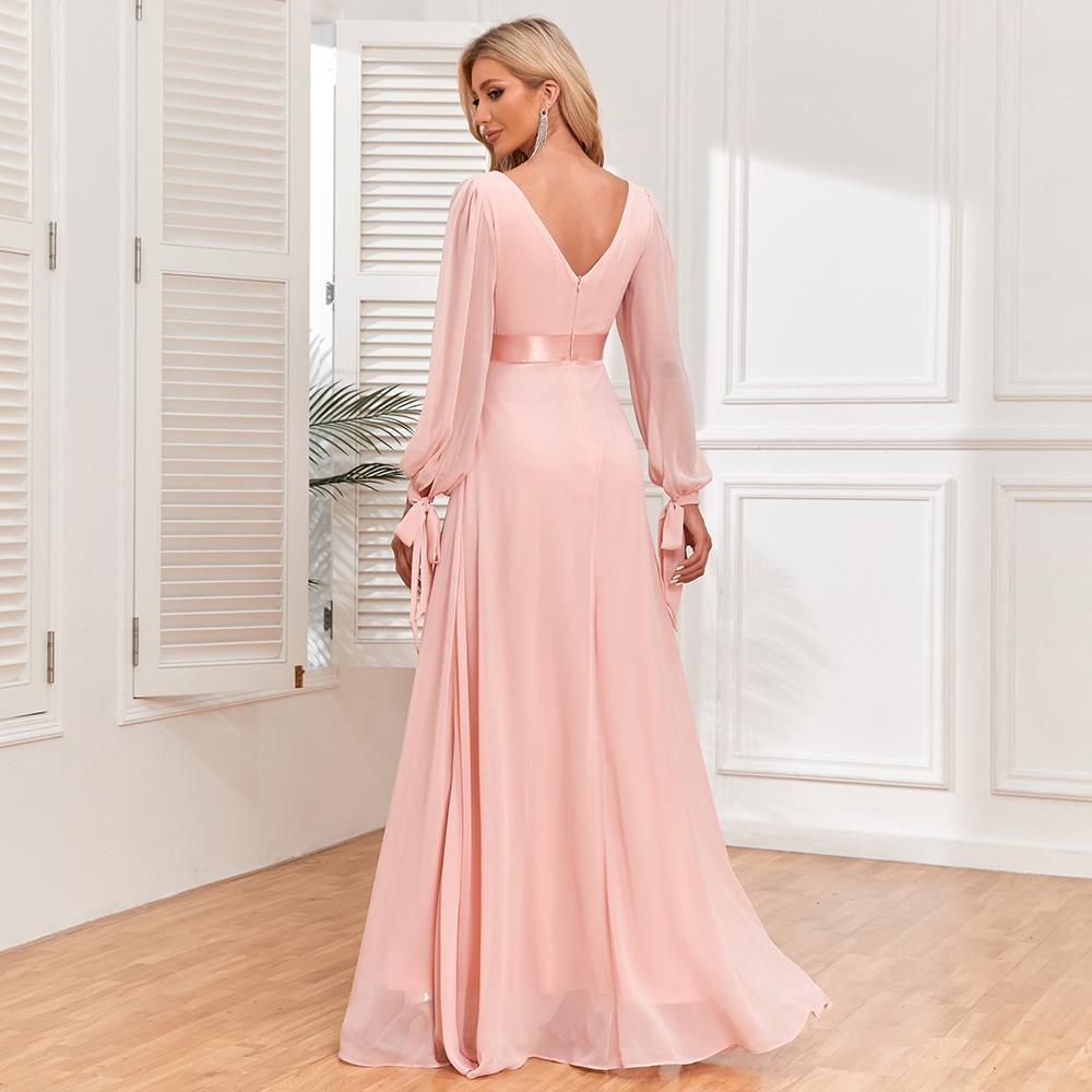 GMXIA Розовое шифоновое платье на подкладке, на шнуровке, с длинными рукавами, с двойным V-образным вырезом, с эластичной резинкой на талии, вечернее платье с пышной юбкой