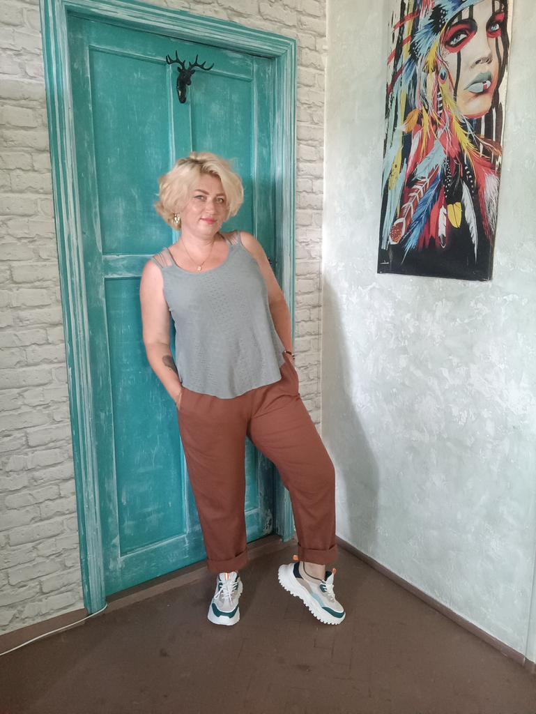 Всем доброго времени суток 🥰 вот эти штаны прямо моя любовь. Не знаю почему, но хочется просто носить. Особенно в эту жару. Они из натурального материала. Аккуратно сшиты. Все швы ровные, нитки не торчат. Без запаха и изъянов. На мои параметры 98, 78, 106 и рост 163см заказала размер XXXL. Они хорошо сели. Потому что я хотела чтобы широкие были, но нужно было на размер меньше точно брать. Размерная таблица соответствует, покупайте по ней. С расчётом или более свободны, или как раз!!! Касательно роста, если ваш рост 170, вам будут по щиколотку. Если вы ещё стройная и бедра не широкие. Они сядут на вас ниже. Поэтому правильно подбирайте размер и наслаждайтесь покупкой. Я ношу с удовольствием. Рекомендую вам данный товар и магазин) А с вами Ксю и до следующего обзора 😉