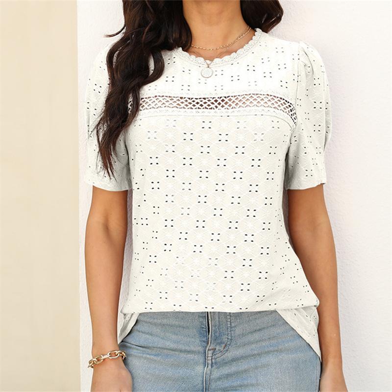 Летняя женская кружевная лоскутная блузка с коротким рукавом розового и белого цвета, повседневная женская пуловер с круглым вырезом, топ — купить товар онлайн с бесплатной доставкой по всему миру!