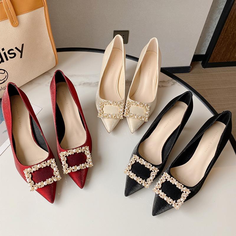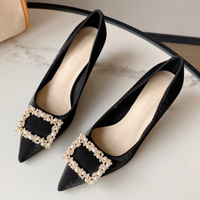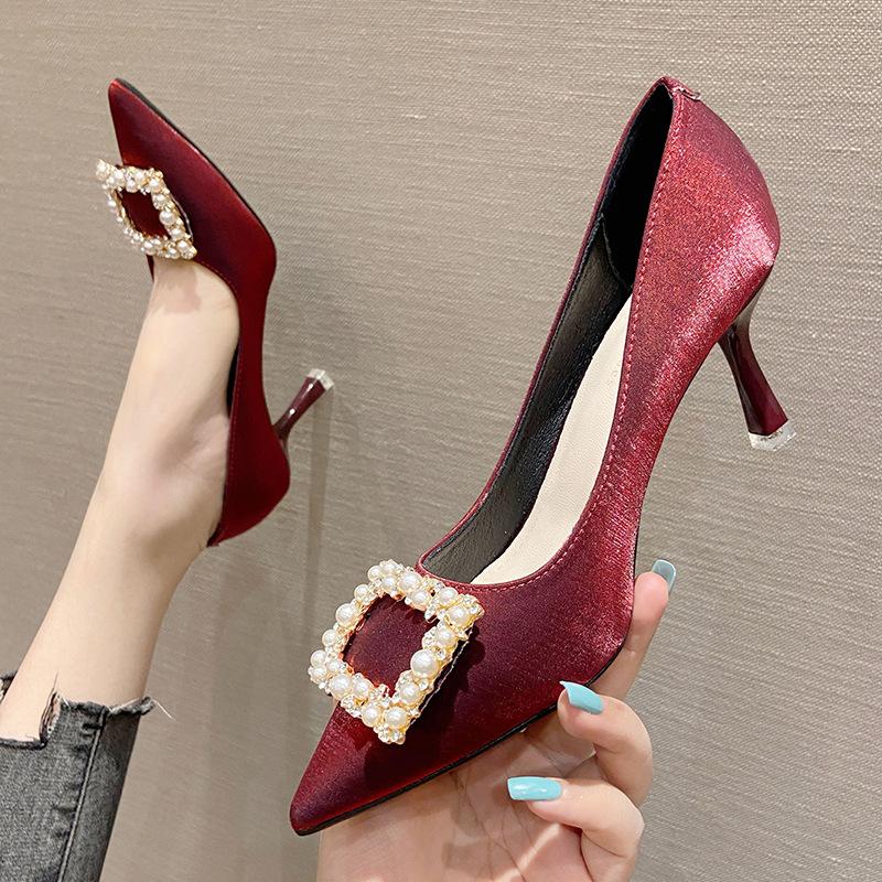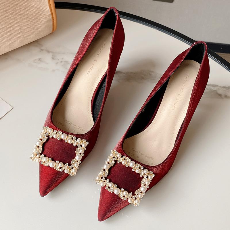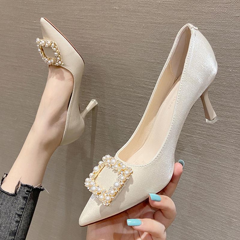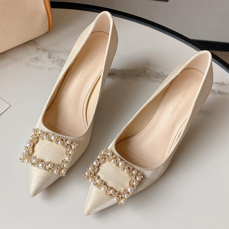 Туфли на шпильке с квадратной пряжкой и жемчугом в сказочном стиле, женские свадебные туфли на высоком каблуке с острым носком, темпераментные белые свадебные туфли