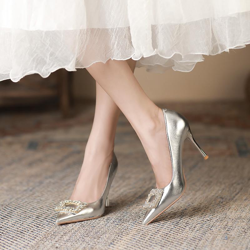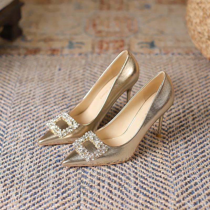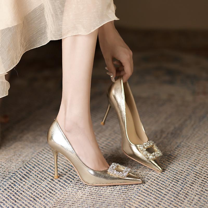 Сексуальные туфли цвета шампанского на высоком каблуке с острым носком на шпильке, новые туфли на высоком каблуке с квадратной пряжкой и стразами