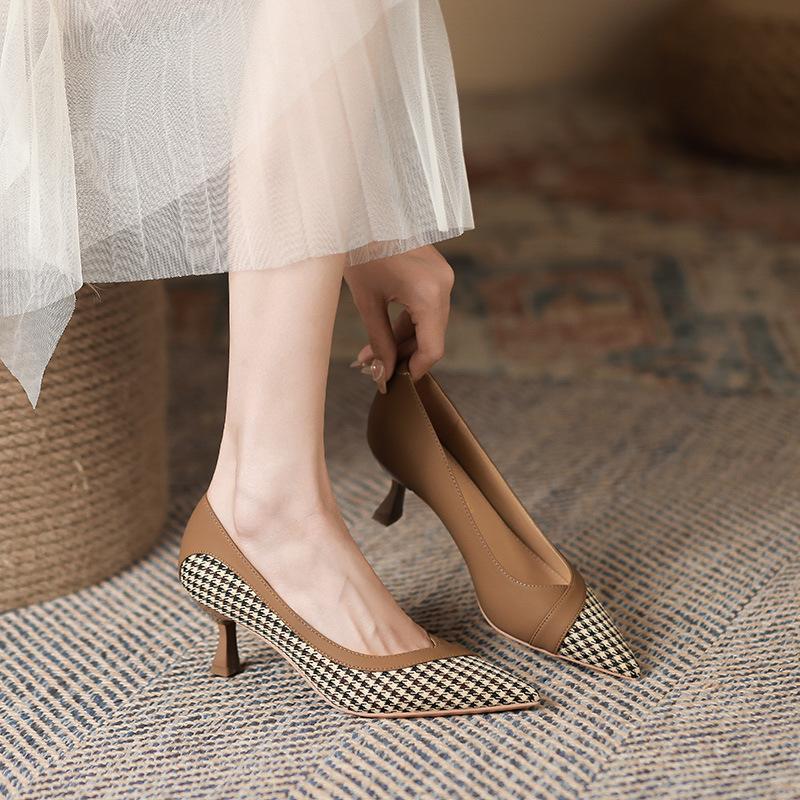 Винтажные одиночные туфли с узором «гусиные лапки» и цветными блоками, женские осенние новые женские туфли на шпильке с острым носком