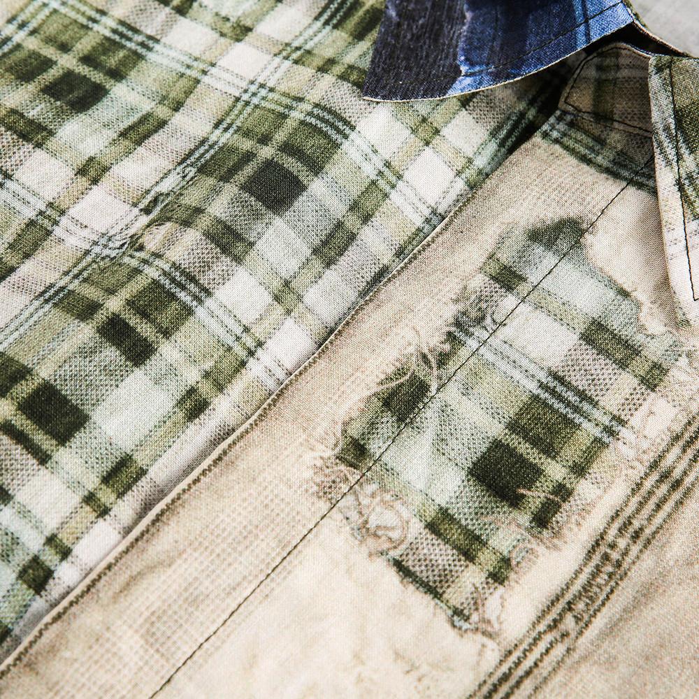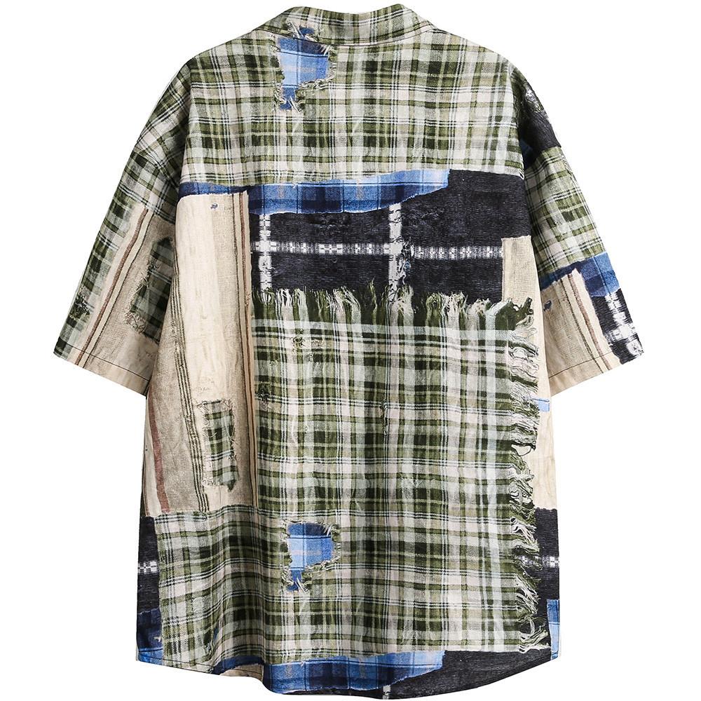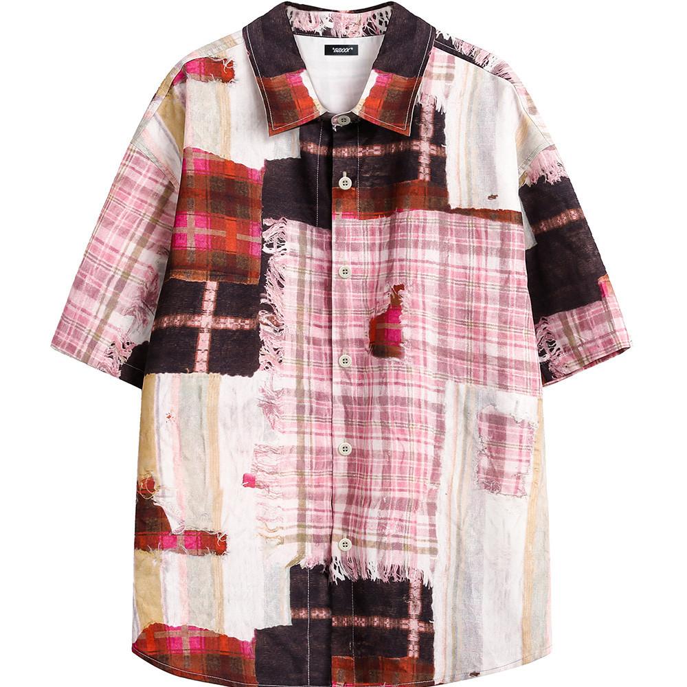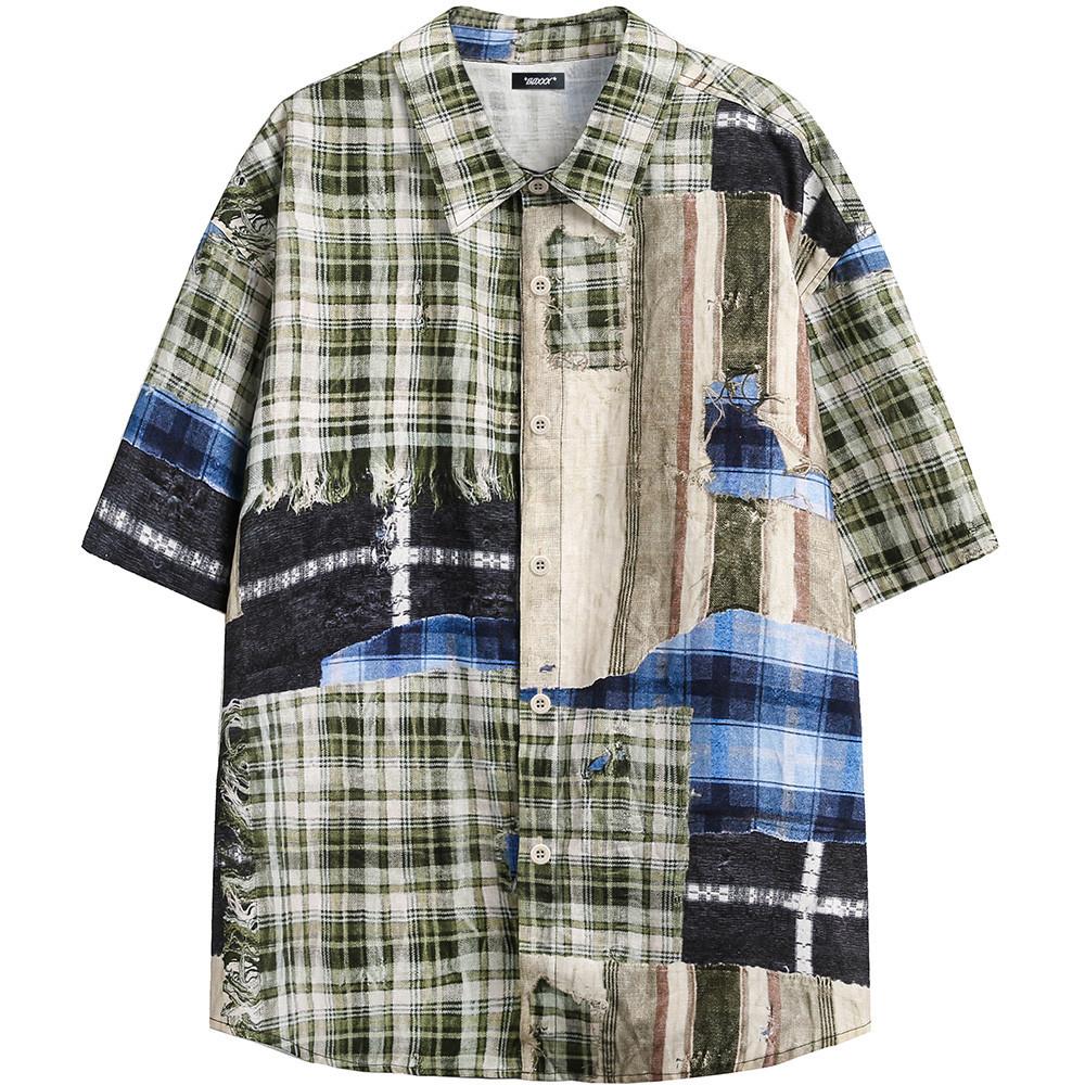 Рубашка в клетку с короткими рукавами в стиле панк-пустошь для мужчин с нерегулярным принтом в стиле пэчворк, свободная рубашка-ниша, летний тренд