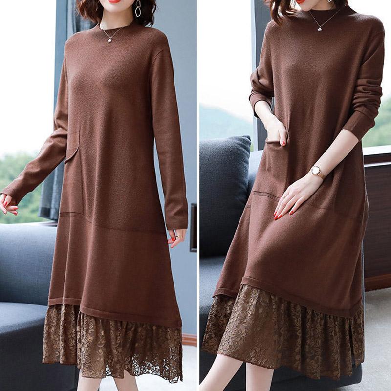 Платье женское осенне-зимнее кружевное удобное эластичное платье-свитер средней длины трикотажные платья с длинными рукавами