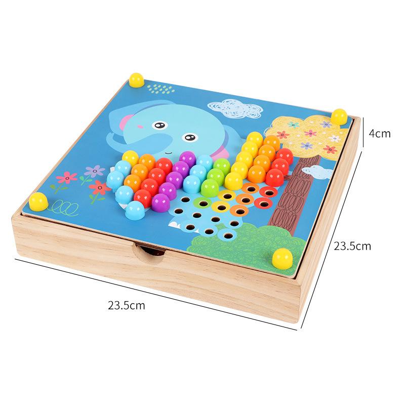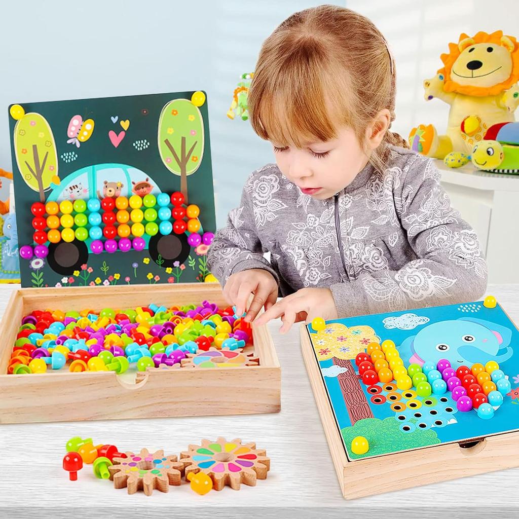 2. 180 красочных кнопок и 10 различных картинок, 5 шестеренок, деревянный футляр создают обучающую игру для маленьких детей.