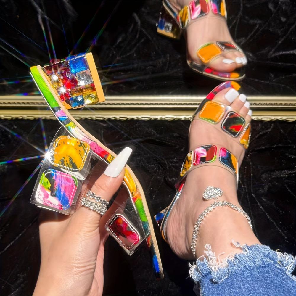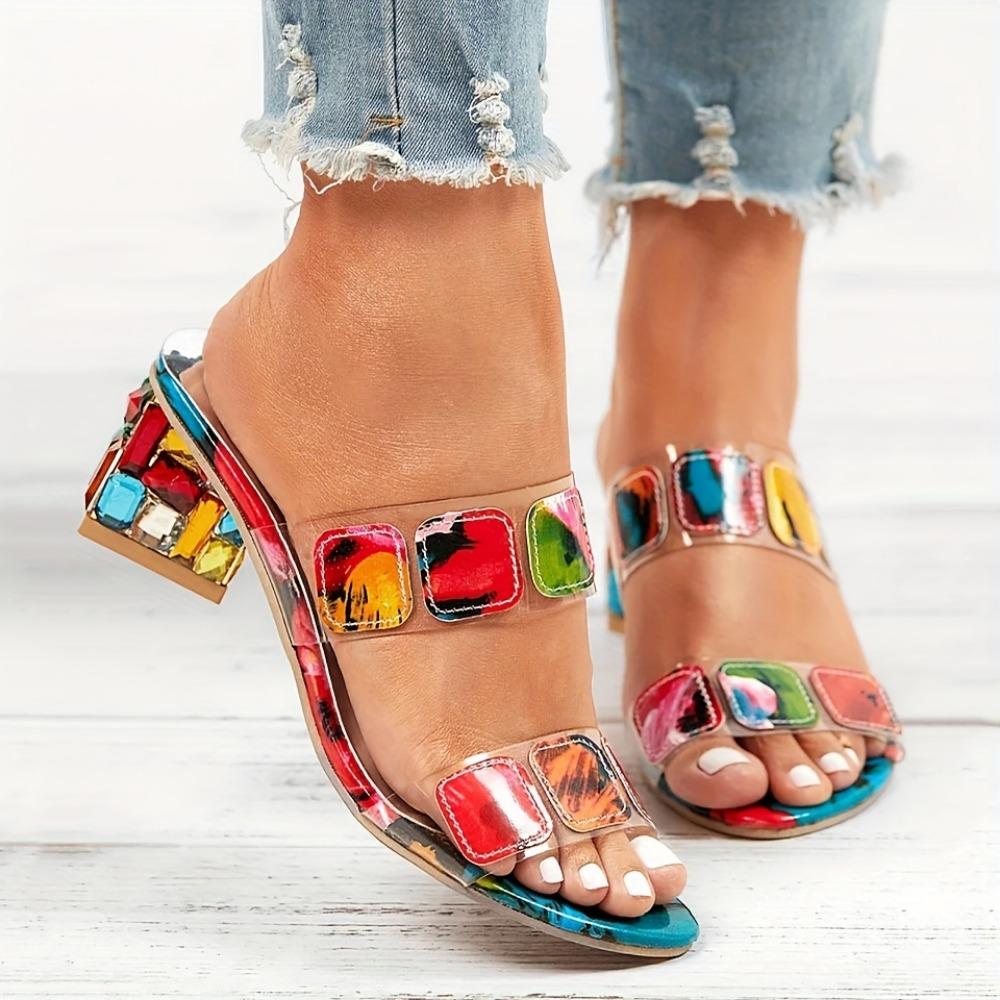 Женские сандалии с ярким клетчатым декором, повседневные туфли без шнуровки на массивном каблуке со стразами, летние пляжные шлепанцы для отпуска