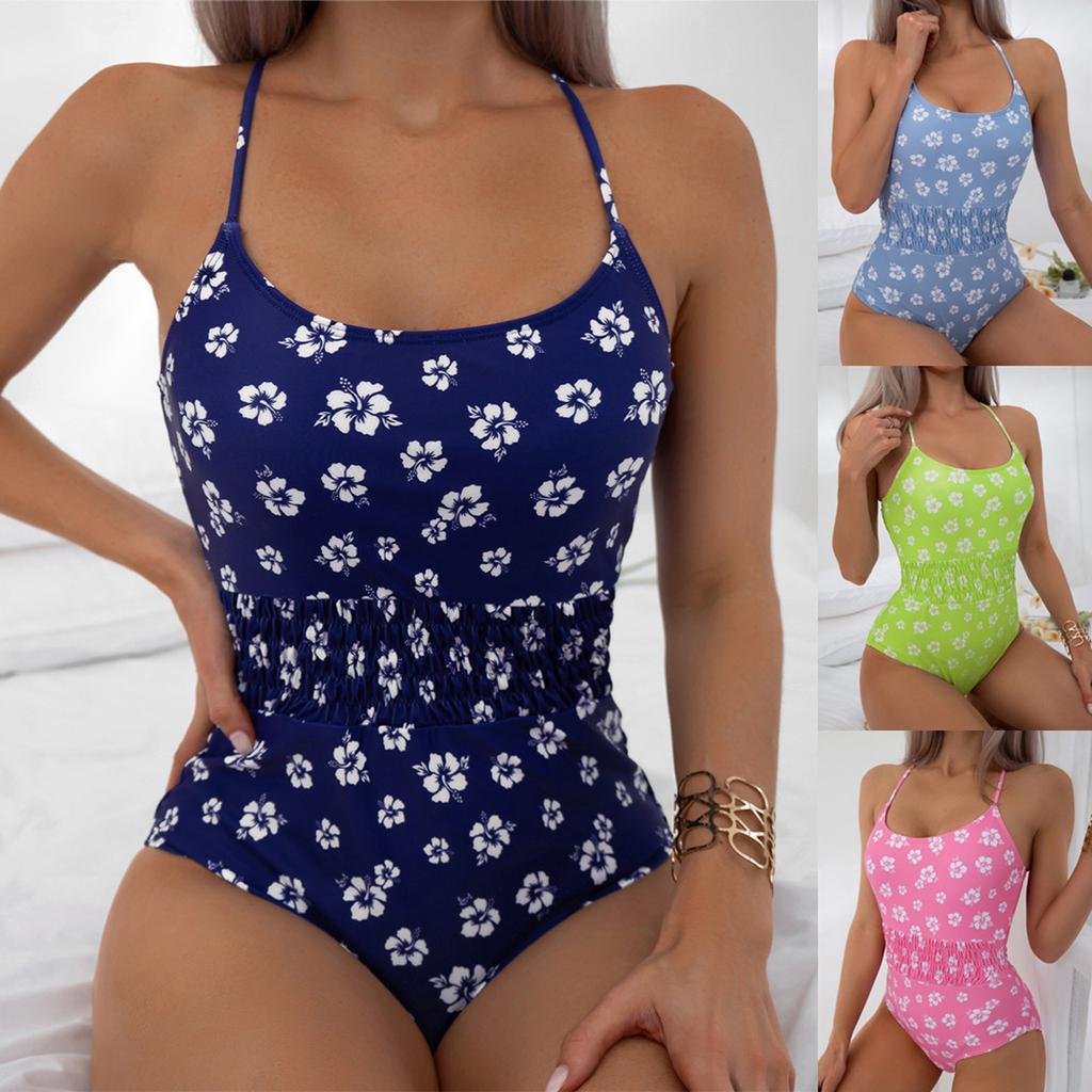 Женский купальный костюм, плиссированный купальный костюм с открытой спиной и милой девушкой со свежим цветочным принтом