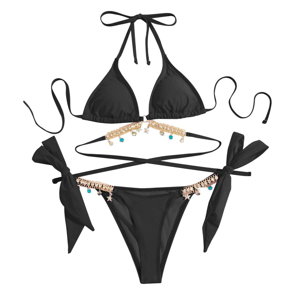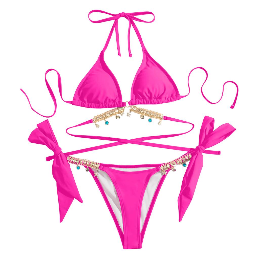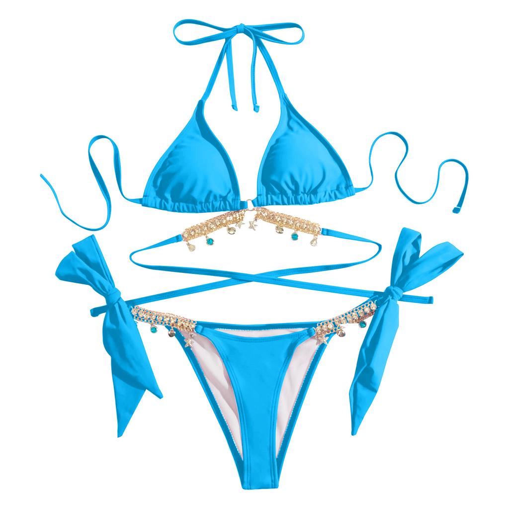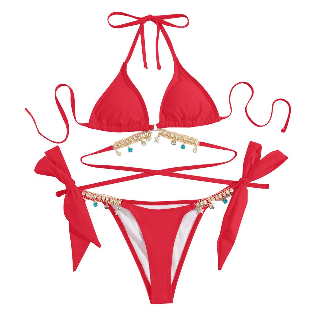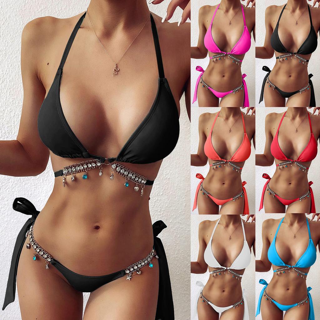 Женская летняя мода, сексуальная однотонная цепочка с бриллиантом и маленьким колокольчиком, комплект бикини на шнуровке на талии