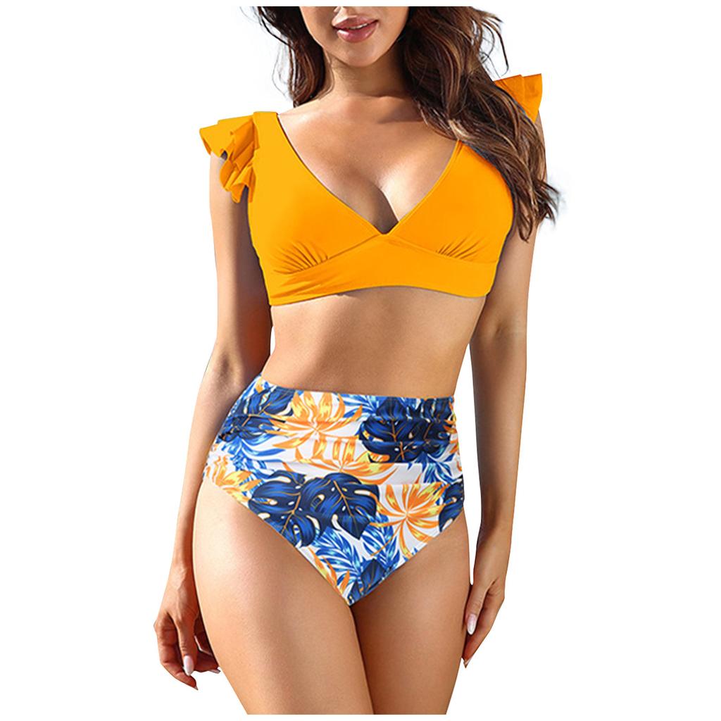 Женское бикини с высокой талией и принтом, разделенными рюшами и подкладкой на груди, купальник без стального бюстгальтера