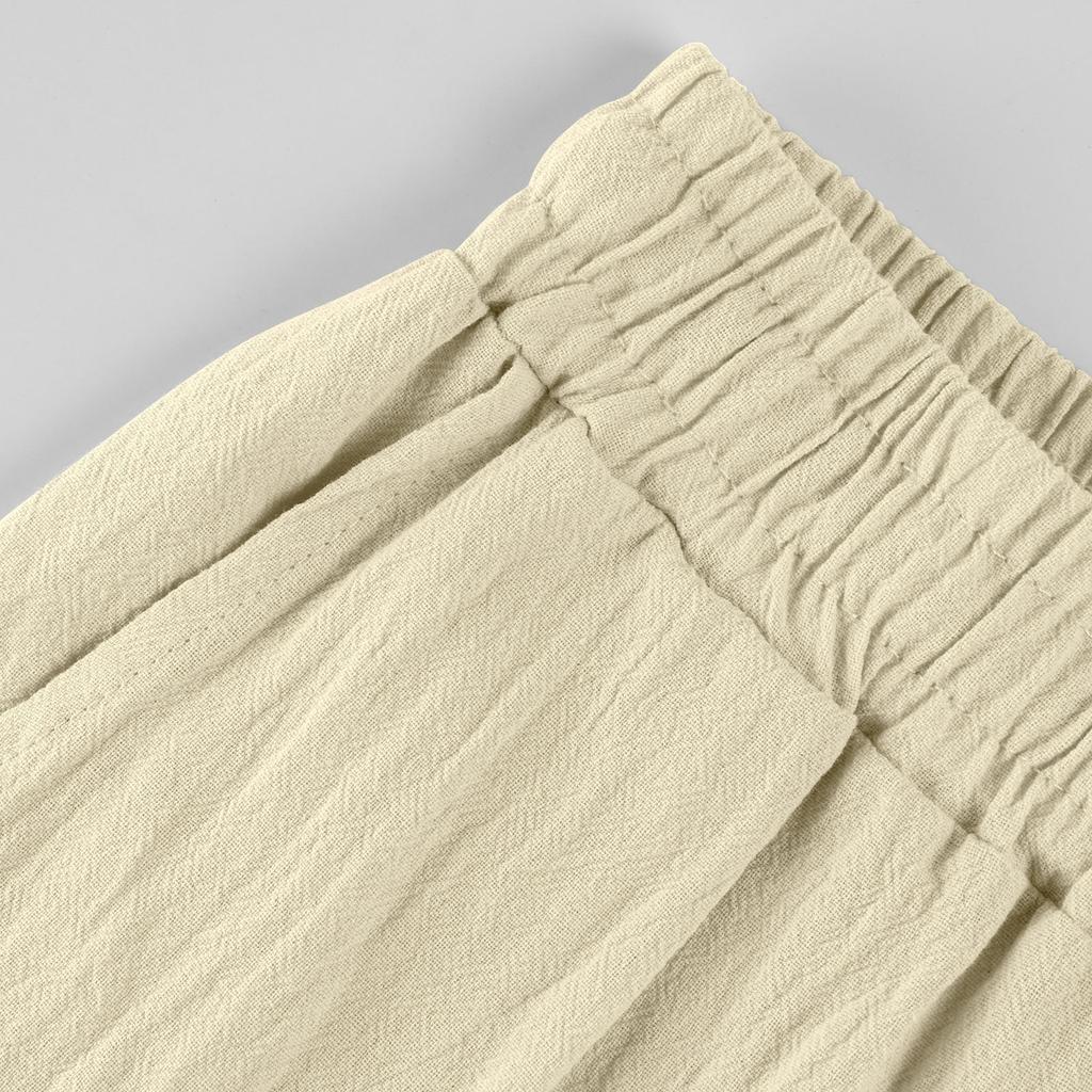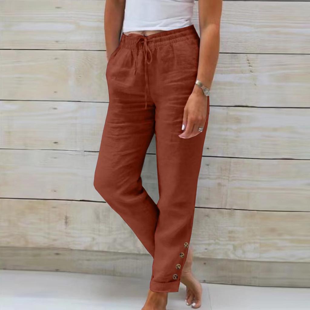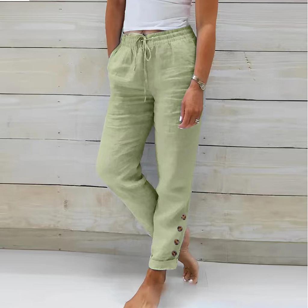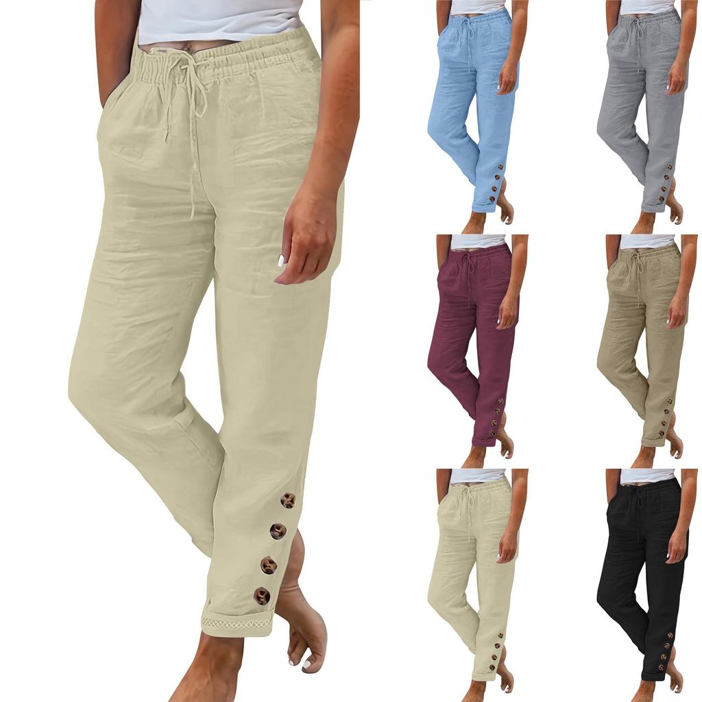 Женские летние эластичные поясные карманы с карманами, однотонные хлопковые льняные широкие брюки, свободные брюки с девятью очками