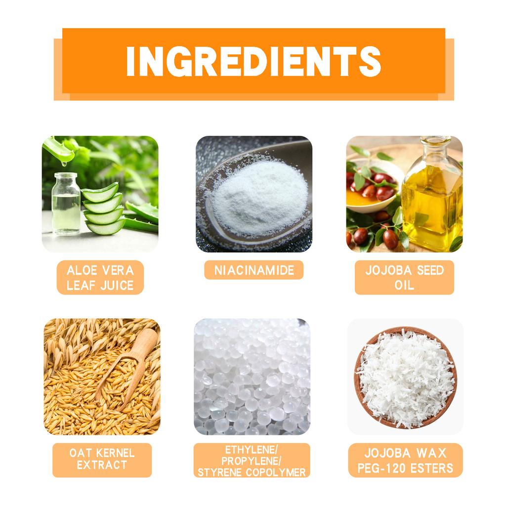 aloe vera leaf juice, niacinamide, jojoba seed oil, oat kernel extract, ethylene/propylene/styrene copolymer, jojoba wax peg-20 ester