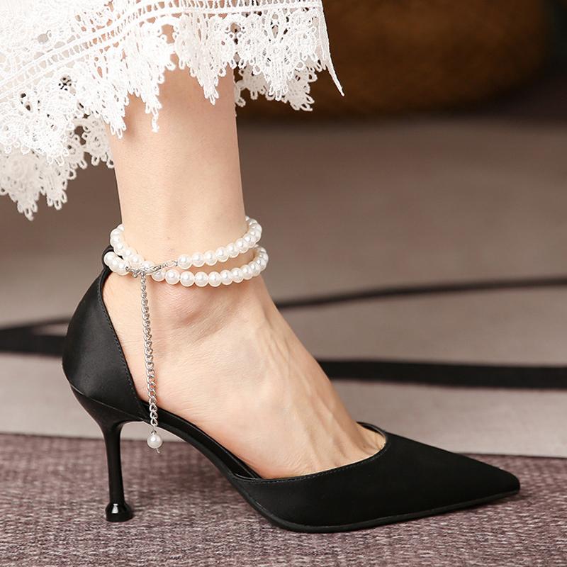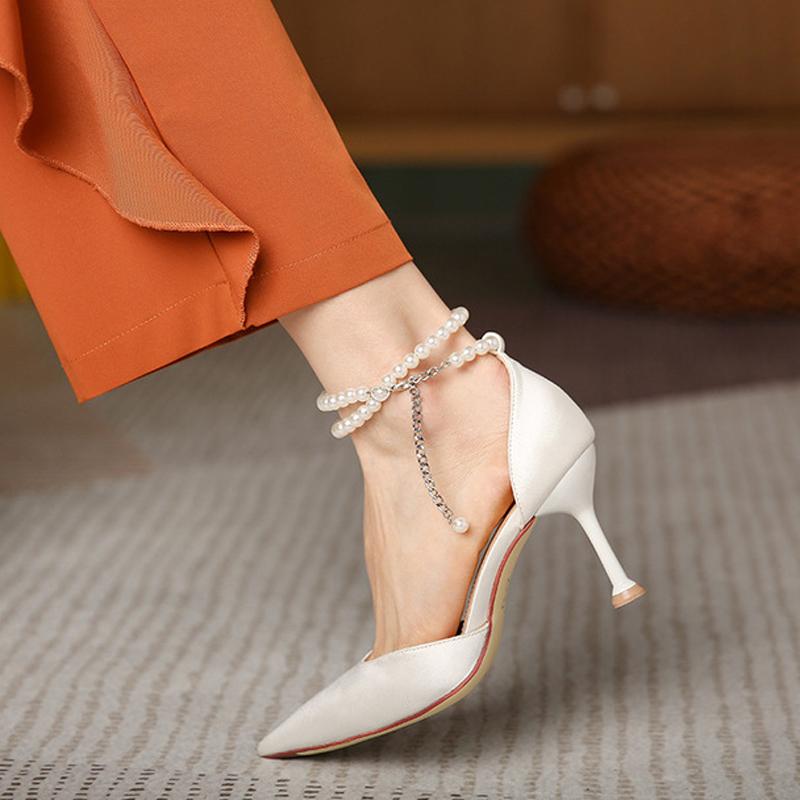 Шелковые женские туфли-лодочки с жемчужным ремешком и ремешками на щиколотке, модные женские туфли-лодочки на высоком каблуке, пикантные модельные свадебные туфли на шпильке