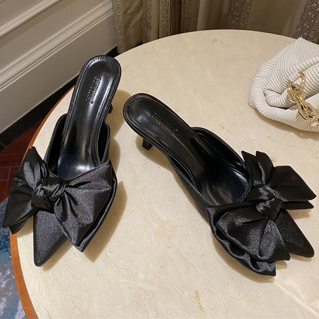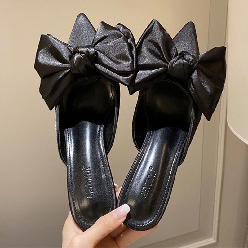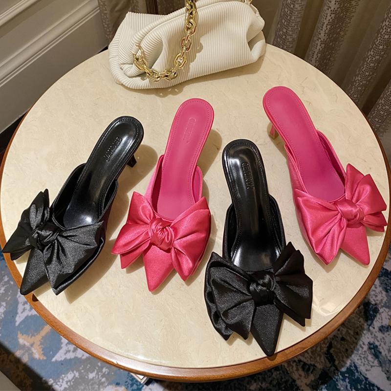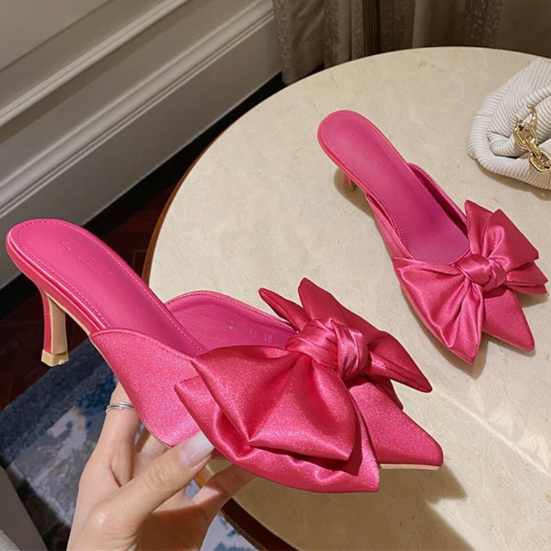 Летние женские тапочки на высоком каблуке 7 см, модные шелковые шлепанцы с бантом и бабочкой, женские туфли-лодочки с острым носком, вечерние розово-красные туфли на низком каблуке