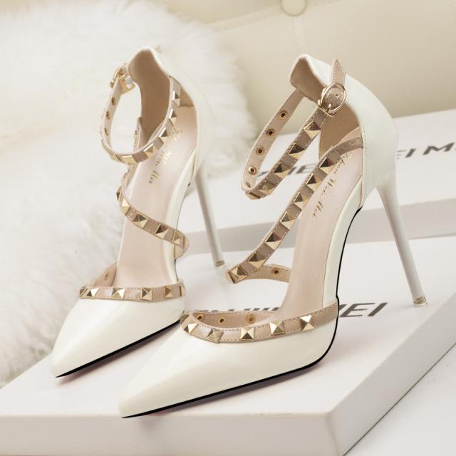Женская обувь туфли-лодочки, простые сексуальные ночные клубы, на тонком каблуке 10 см, на высоком каблуке с заостренной головкой и заклепками, с полым поясом с надписью