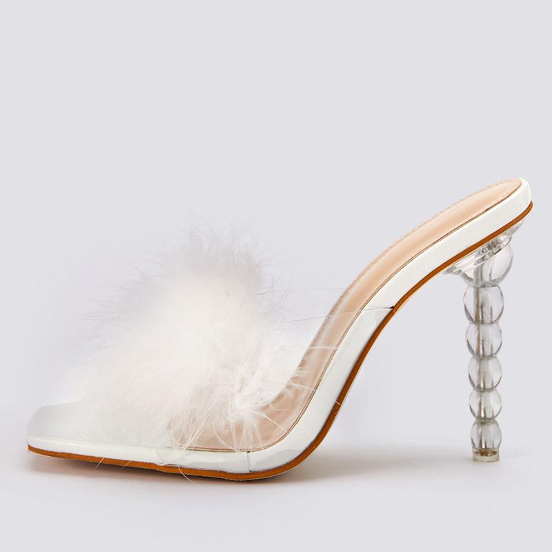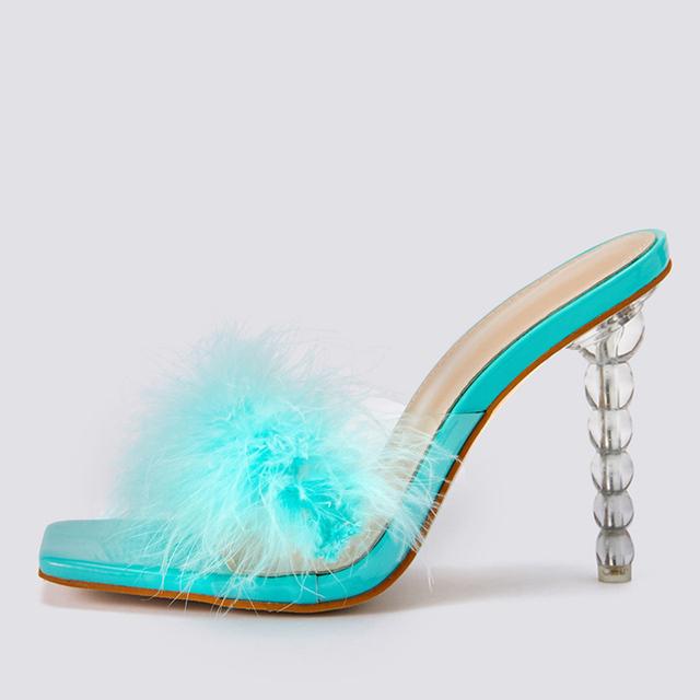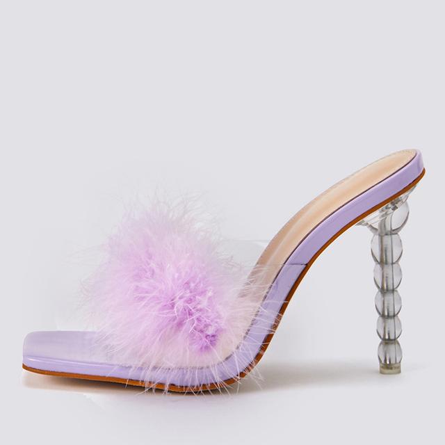 Liyke странный стиль, прозрачные тапочки на высоком каблуке, модные фиолетовые летние сандалии с мехом и перьями, обувь с открытым носком, женские шлепанцы