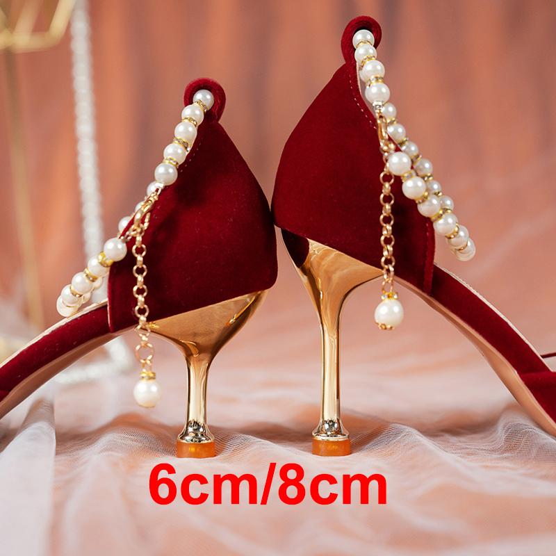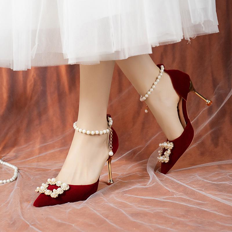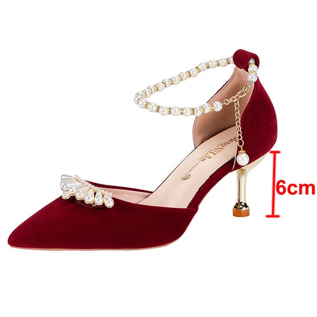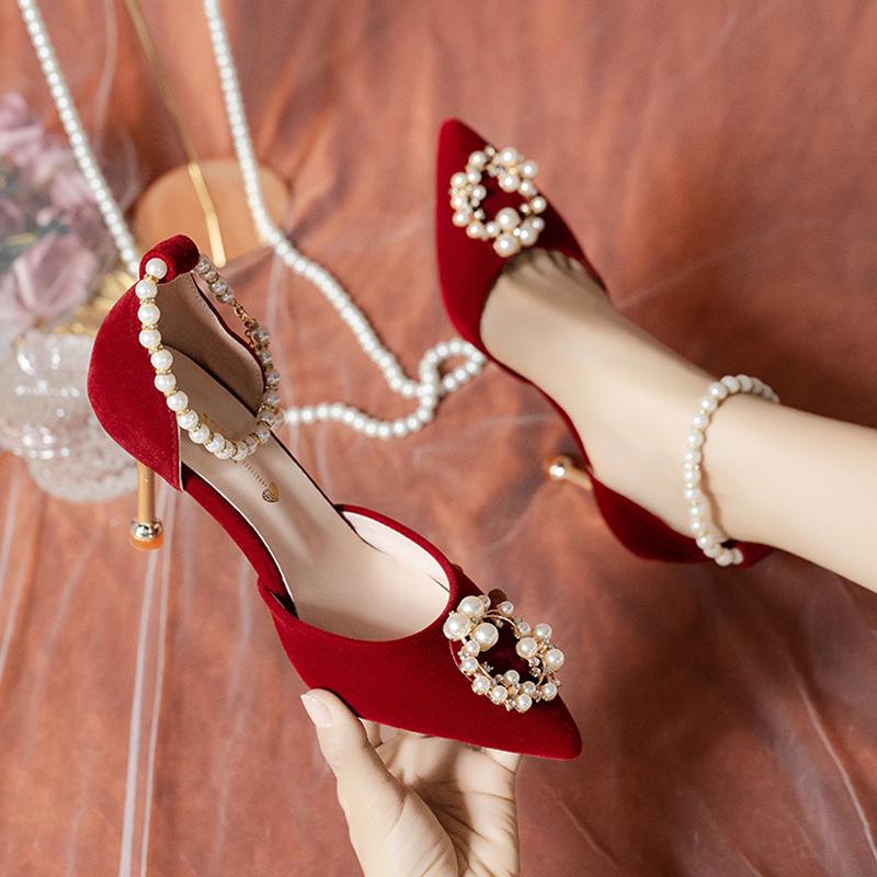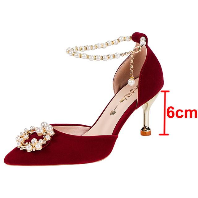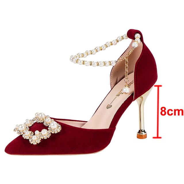 Элегантные туфли для невесты с жемчужной короной, женские туфли-лодочки на тонком каблуке с ремешком на щиколотке, женские свадебные туфли из флока с острым носком на высоком каблуке