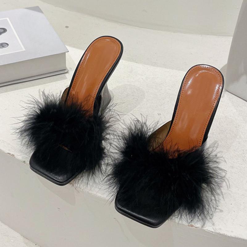 Размер 35–41, пикантные необычные прозрачные тапочки на каблуке, модные летние сандалии с меховыми перьями, открытые носки без шнуровки, прозрачные туфли, женские шлепанцы