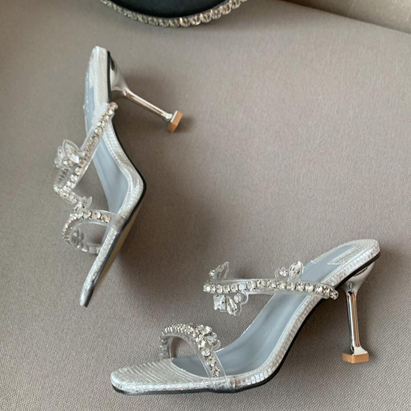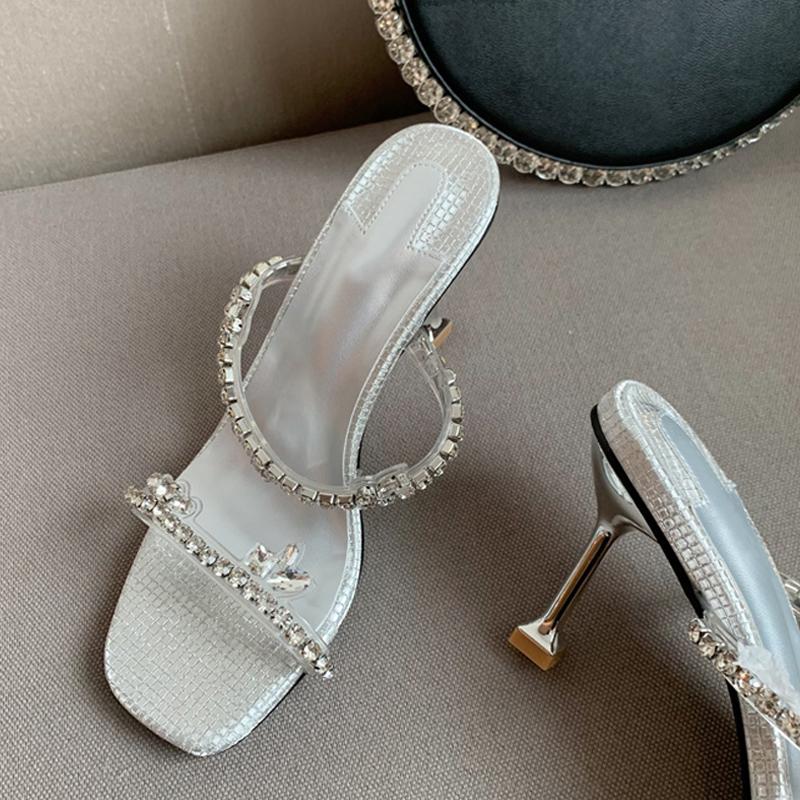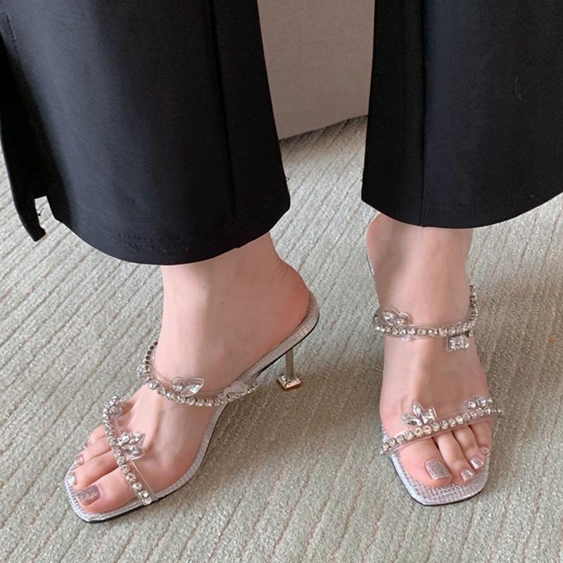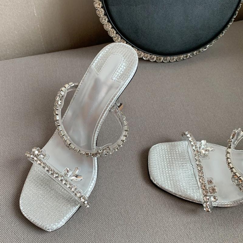 Liyke/Новые прозрачные тапочки из ПВХ со стразами и кристаллами, женские скользящие сандалии с квадратным носком, странные сандалии на высоком каблуке, вечерние свадебные туфли