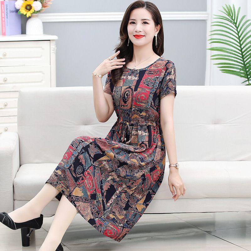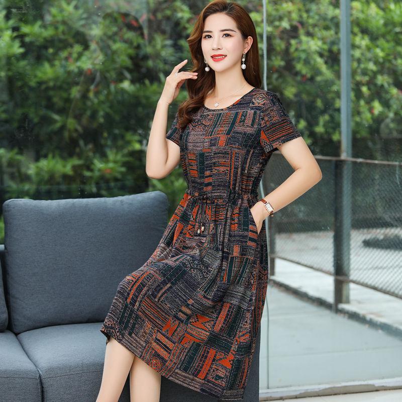 Женское платье среднего возраста и пожилого возраста. Летнее платье длиной до колена с короткими рукавами и круглым вырезом, большая хлопковая шелковая длинная юбка.
