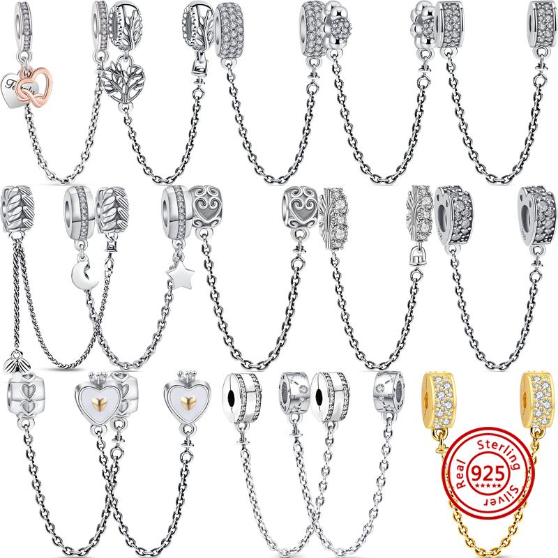 S925 Серебряные Звезды и Луны Семейные Деревья Проложить Сверкающие Цепи Безопасности Подвески Бусины Подходит Оригинальные Подвески Браслет Ювелирные Изделия