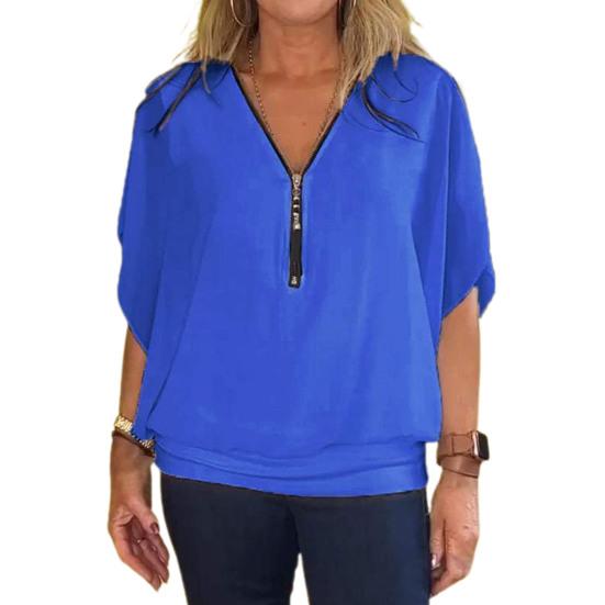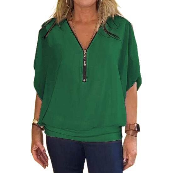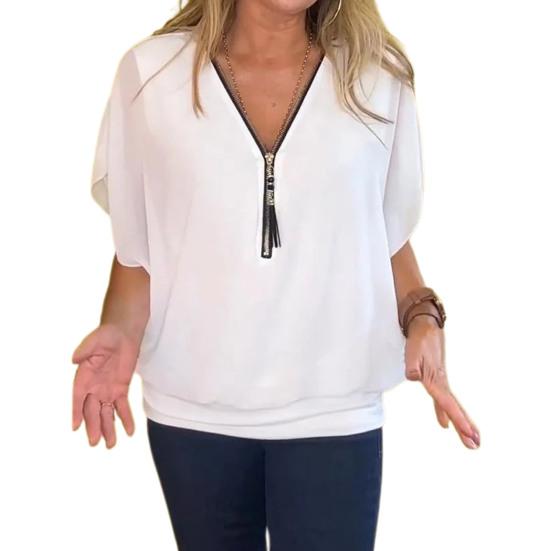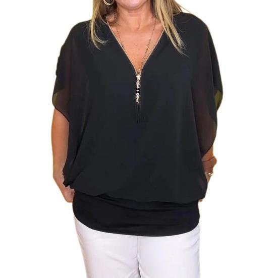 Улучшите свой гардероб этой шикарной шифоновой рубашкой со стильным V-образным вырезом и модными рукавами «летучая мышь».. Половина молнии придает свободному дизайну пуловера нотку изысканности..