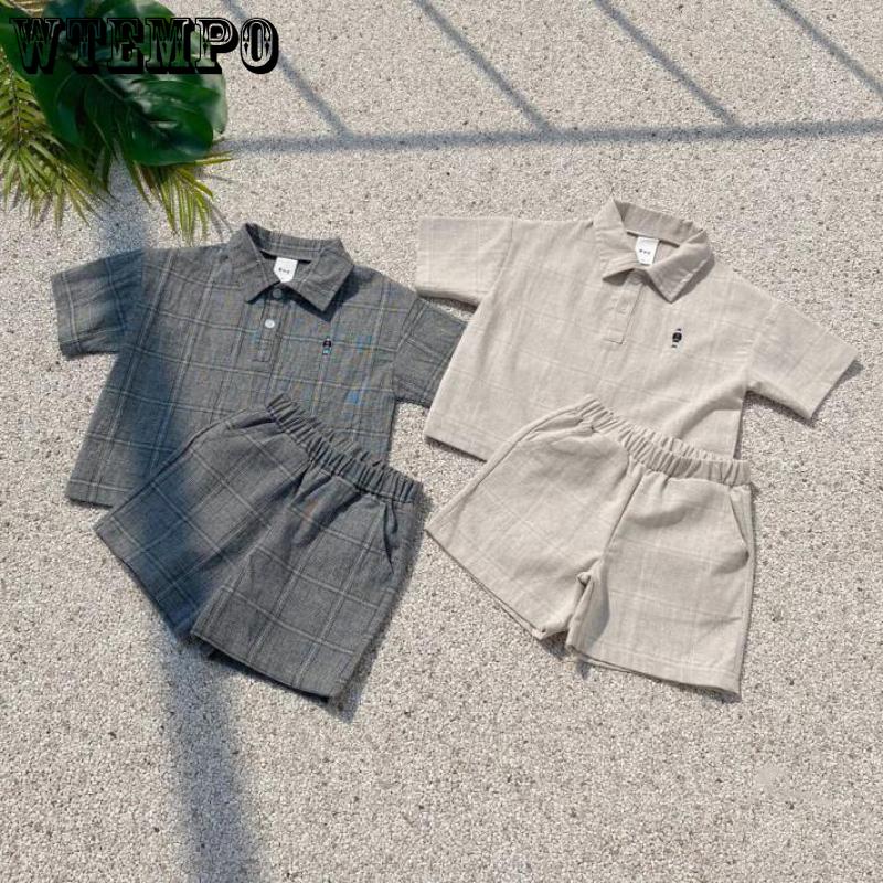 Детский летний клетчатый спортивный костюм для маленьких мальчиков, повседневная простая футболка-поло, топы с отложным воротником + свободные шорты, мягкая верхняя одежда для девочек, костюм