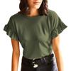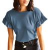 Женская футболка с коротким рукавом, повседневные базовые футболки, летние однотонные вязаные футболки свободного покроя с рюшами и круглым вырезом, блузки