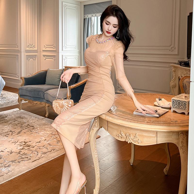 GMXIA Золотое вечернее платье Банкетное осенне-зимнее платье Тонкое сетчатое платье с пайетками во французском стиле с бриллиантами