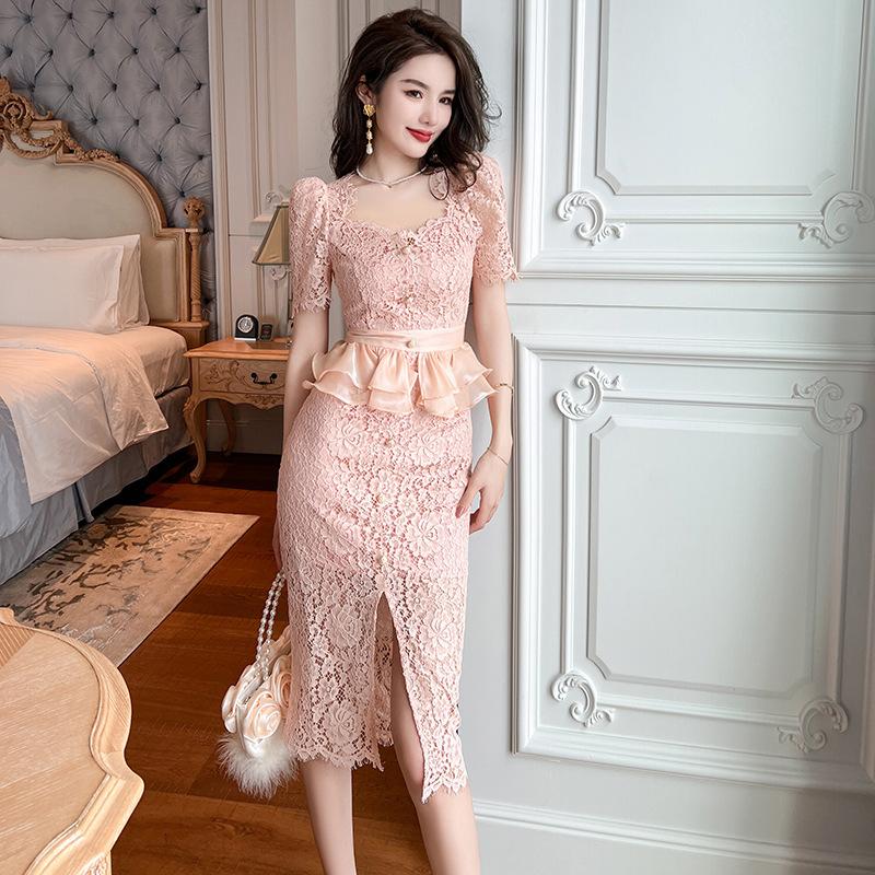 GMXIA Летнее женское милое розовое кружевное платье из темперы с квадратным воротником на талии и баской, драпированное на бедрах — купить товар онлайн с бесплатной доставкой по всему миру!