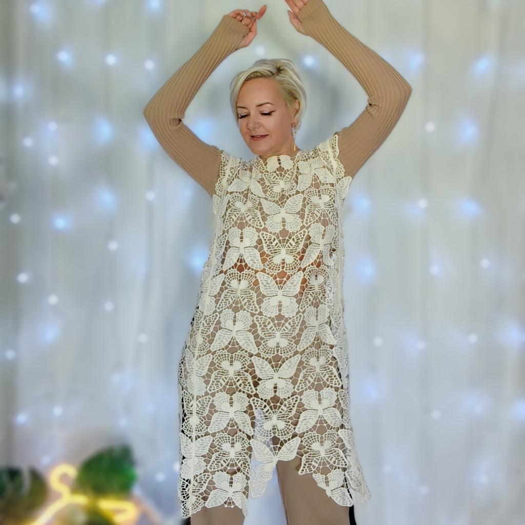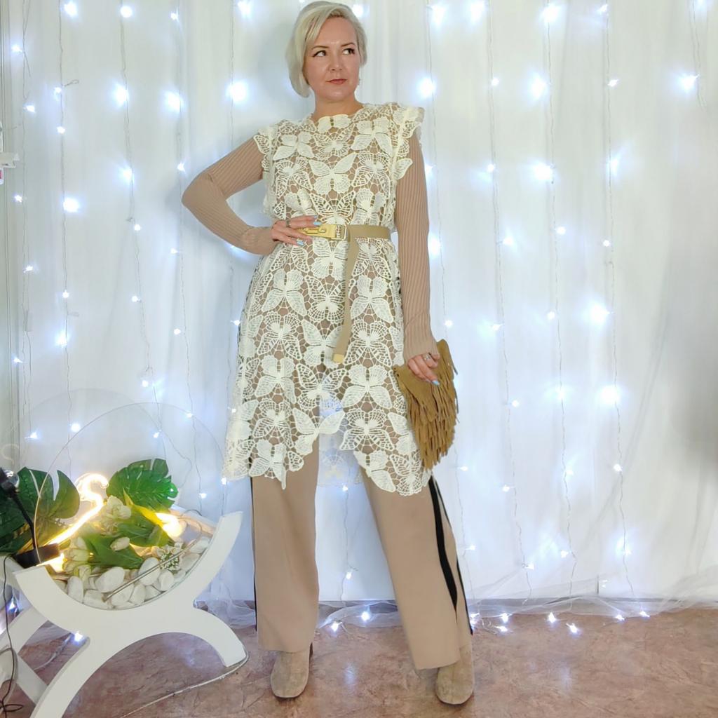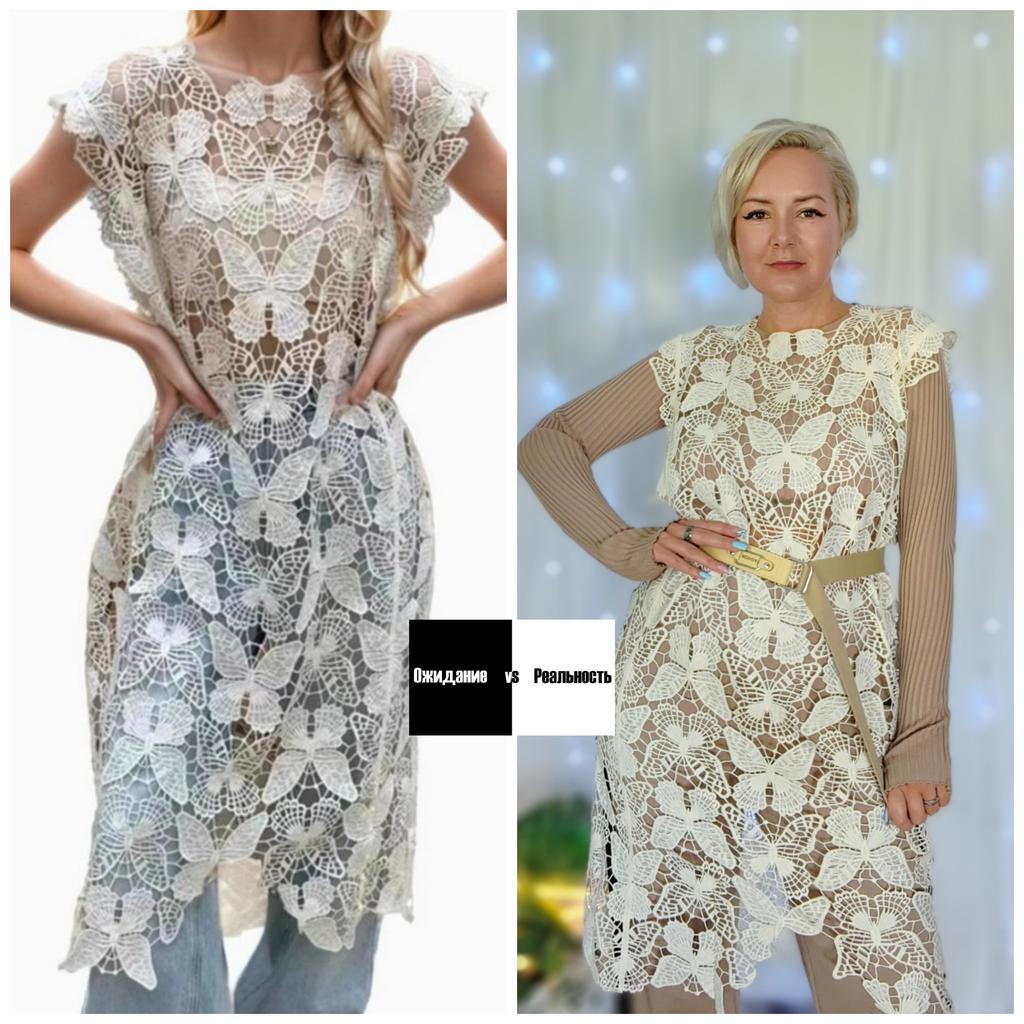 Кружевное платье - накидка с бабочками. Привет! Я тут подумала, а можно ли эту на первый взгляд летнюю тунику вписать в осенние образы. И у меня получилось, все образы тут не поместятся в видео говорю, где посмотреть другие образы. ‼️Добавила разговорное видео, там больше деталей, посмотрите перед покупкой ‼️ Ткань: Кружево плотное и синтетические, не тянется. Кружево хорошего качества порвать его будет сложно, немного фактурное. Дизайн: Платье ассеметричное по низу, прямого кроя с широкой проймой рукава. Размер: На мне единый размер. Мои параметры : рост 172 см 98/76/106 см 📏Детали : Длина 106 см Плечи 50 см ОГ 122 см ОТ 120 см ОБ 120 см Резюмирую : Крутая вещь очень красиво она садится в образы создаёт просто невероятный эффект! Очень рекомендую 💯 Я не прощаюсь, M_K #бабье_лето
