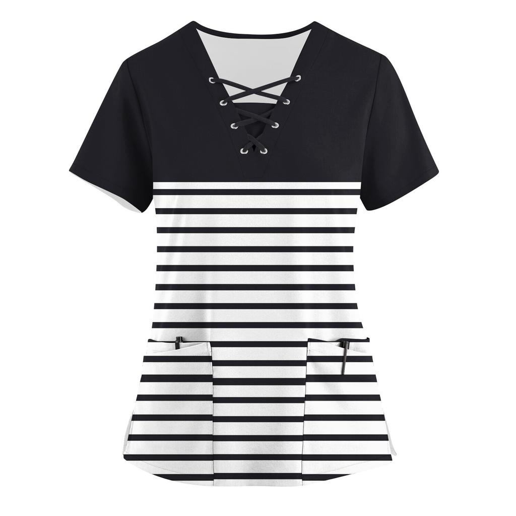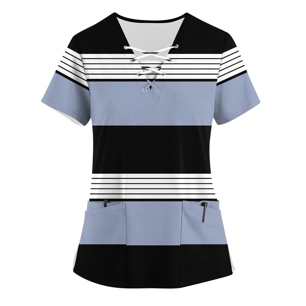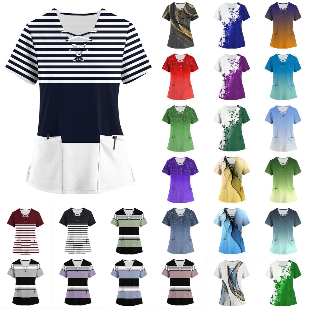 Рабочая форма больших размеров с принтом, топы для женщин, забавные футболки с короткими рукавами и v-образным вырезом с перекрестным принтом, рабочая одежда, футболка с карманами