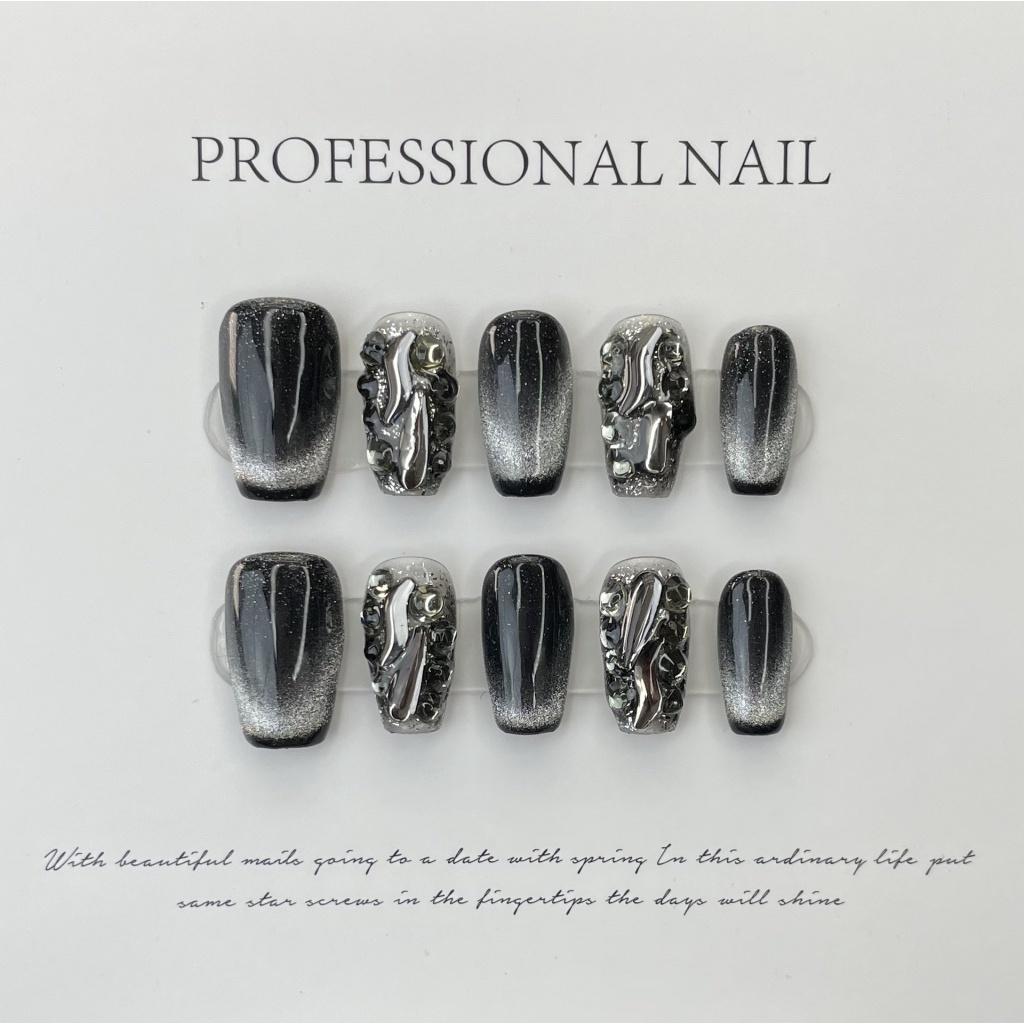 Набор накладных ногтей «кошачий глаз» РУЧНОЙ РАБОТЫ с клеем, полный бриллиантов, белые и темные нишевые черные накладные ногти